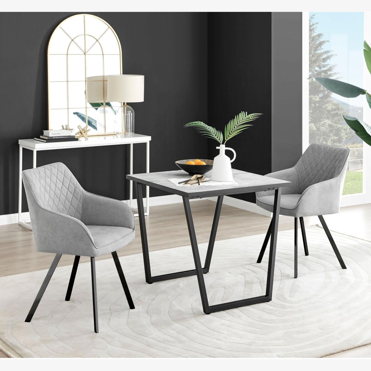 The Carson square 2 seater marble-effect dining table is a statement piece for the interiors connoisseur. It oozes luxury and opulence. Featuring an 80cm x 80cm square melamine tabletop made from on-trend marble effect veneer which is also scratch resistant! It's a compact 2 seater dining table perfect for smaller spaces. Sitting on striking statement U shaped legs in black powder-coated metal. A sleek, stylish dining table with minimalist industrial vibes. This beautifully designed dining table will set the scene for a stylish and luxurious room. Want to complete the look Shop our stylish dining chair range for ultimate ergonomic comfort.