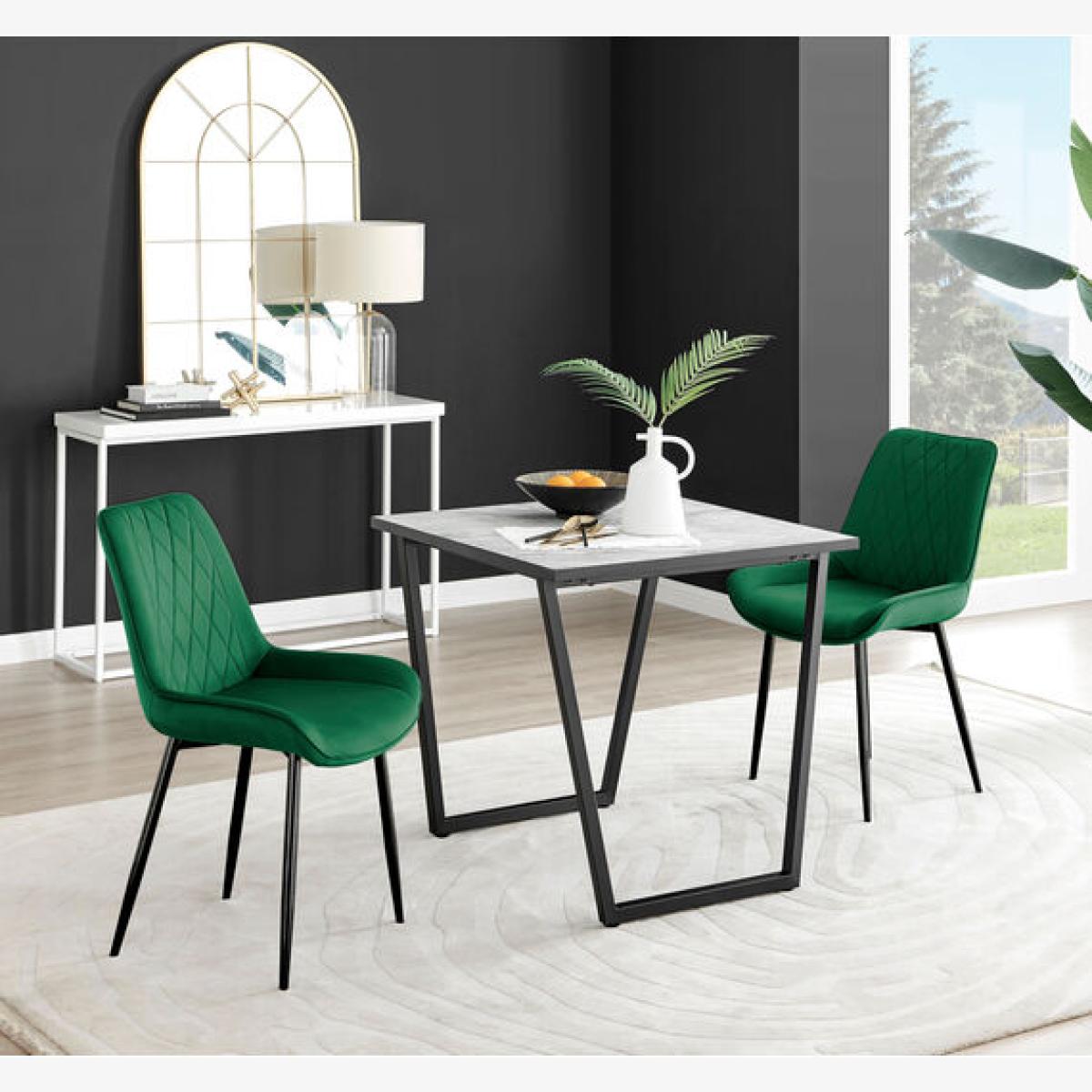 The Carson square 2 seater marble-effect dining table is a statement piece for the interiors connoisseur. It oozes luxury and opulence. Featuring an 80cm x 80cm square melamine tabletop made from on-trend marble effect veneer which is also scratch resistant! It's a compact 2 seater dining table perfect for smaller spaces. Sitting on striking statement U shaped legs in black powder-coated metal. A sleek, stylish dining table with minimalist industrial vibes. This beautifully designed dining table will set the scene for a stylish and luxurious room. Want to complete the look Shop our stylish dining chair range for ultimate ergonomic comfort.