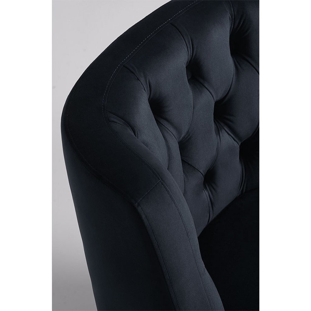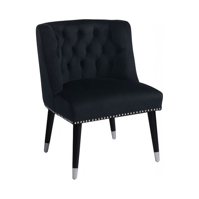 Traditional deep buttoning gives character to this handsome chair Can be used as a dining or occasional chair Finely tailored velvet upholstery Comfortable foam seat with sprung Stained solid ash legs Elegant and practical polished chrome ferrules Minimal assembly required, simply attach legs