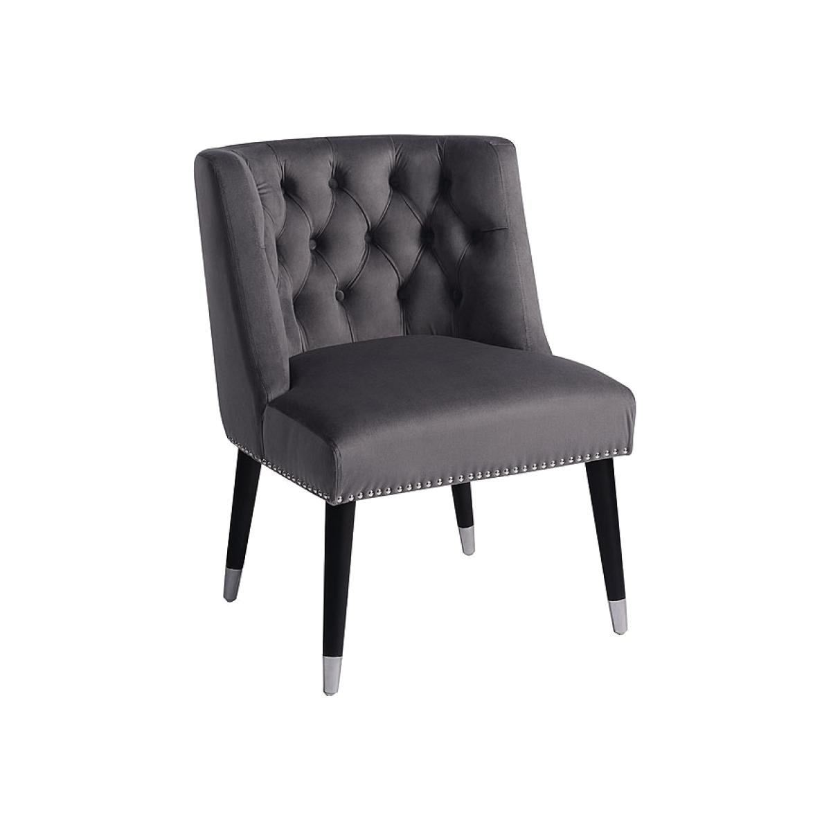 Traditional deep buttoning gives character to this handsome chair. Can be used as a dining or occasional chair. Finely tailored velvet upholstery. Comfortable foam seat with sprung. Stained solid ash legs. Elegant and practical polished chrome ferrules. Minimal assembly required, simply attach legs.