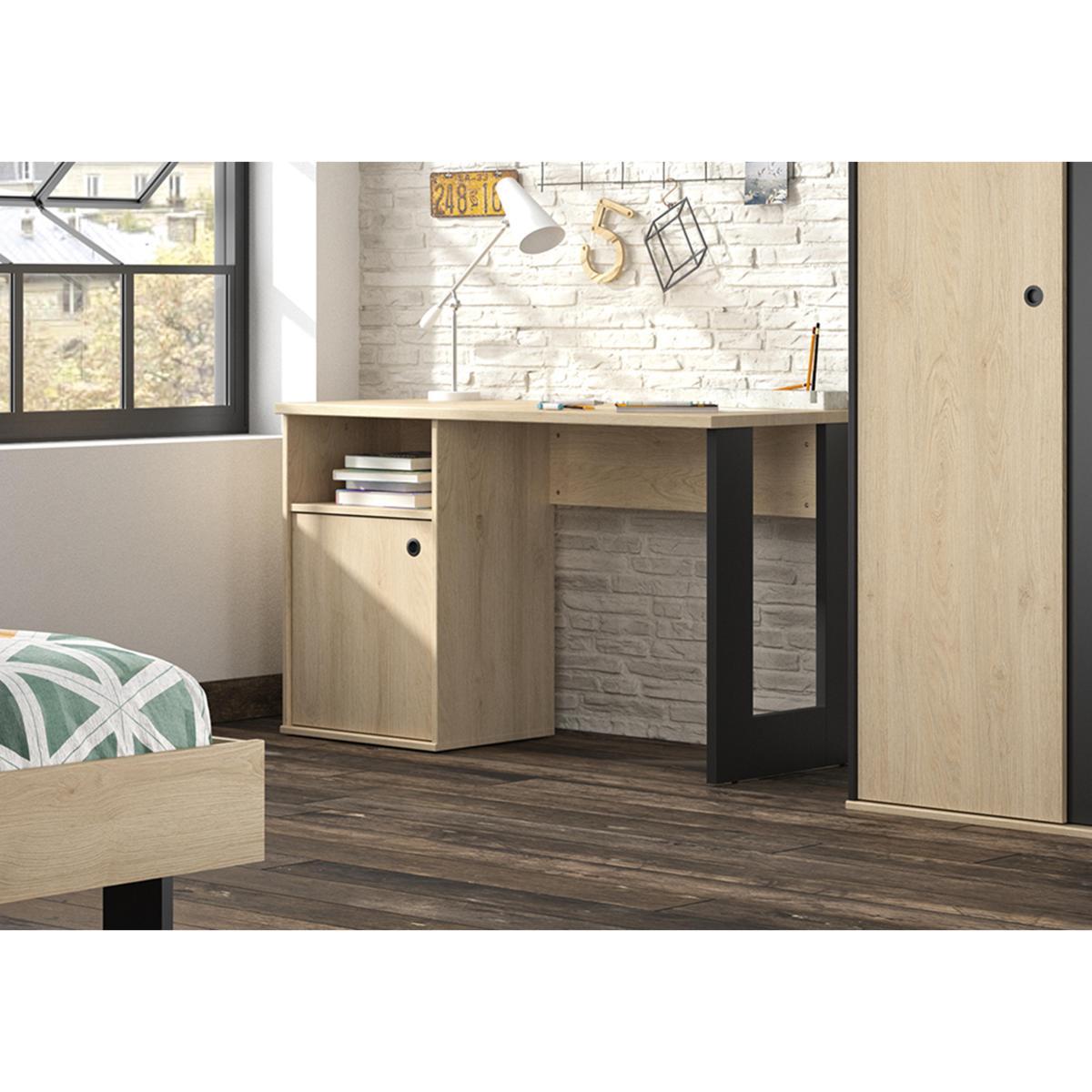 An online exclusive at Furniture Village, the sophisticated modern Carter range will take your kids right into their teenage years in real style. Each piece has a smooth light chestnut finish, contrasting with bold black linear detailing. Younger children and young teens will love the high sleeper bed, which can sit over a single bed to make ‘L’ shaped bunks if two are sharing a room. Older teens will appreciate the distinctive linear style of the beds, desks and wardrobes. Practical and hardwearing, this furniture will last for years, and suits spare rooms too. Assembled for you on delivery. Distinctive modern desk with a pedestal storage and a bold, black U-shaped leg. Ideal for homework and revision – and even working at home in a spare room. What you’ll love. Bold, linear modern style suits all ages. Smooth chestnut finish. The black U-shaped leg is a bold touch. Open cubby hole and useful cupboard storage in the pedestal. Meets British safety standards for children’s furniture. Great value price. A Furniture Village online exclusive. What you need to know. Cupboard has a round, cut-out handle. Pedestal cupboard has one fixed shelf. Heavy duty construction. Melamine finish is scratch and heat resistant for durability. Assembled for you on delivery. Part of the modern Carter range. WARNING!. Furniture can tip over unexpectedly and cause injury. This item shall be fixed to a wall using the anti-tip kit provided with the furniture. Be sure to use the correct wall fixings suitable for the walls in your home.