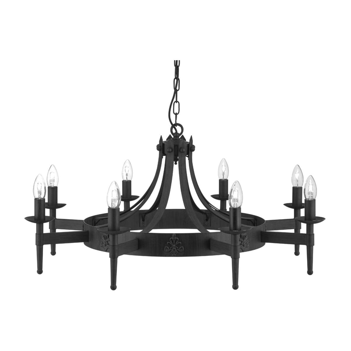 This candelabra style fitting is sure to add a bold feel to any room. The wrought iron finish adds a unique Gothic character to the fitting. This range offers many styles which allows you the freedom of choice. The lamps are positioned in a circular way to allow the light to shine throughout the room. This eight light ceiling light is also available in twelve light and five light ceiling lights, and a matching wall light. Other styles are also available from the range.