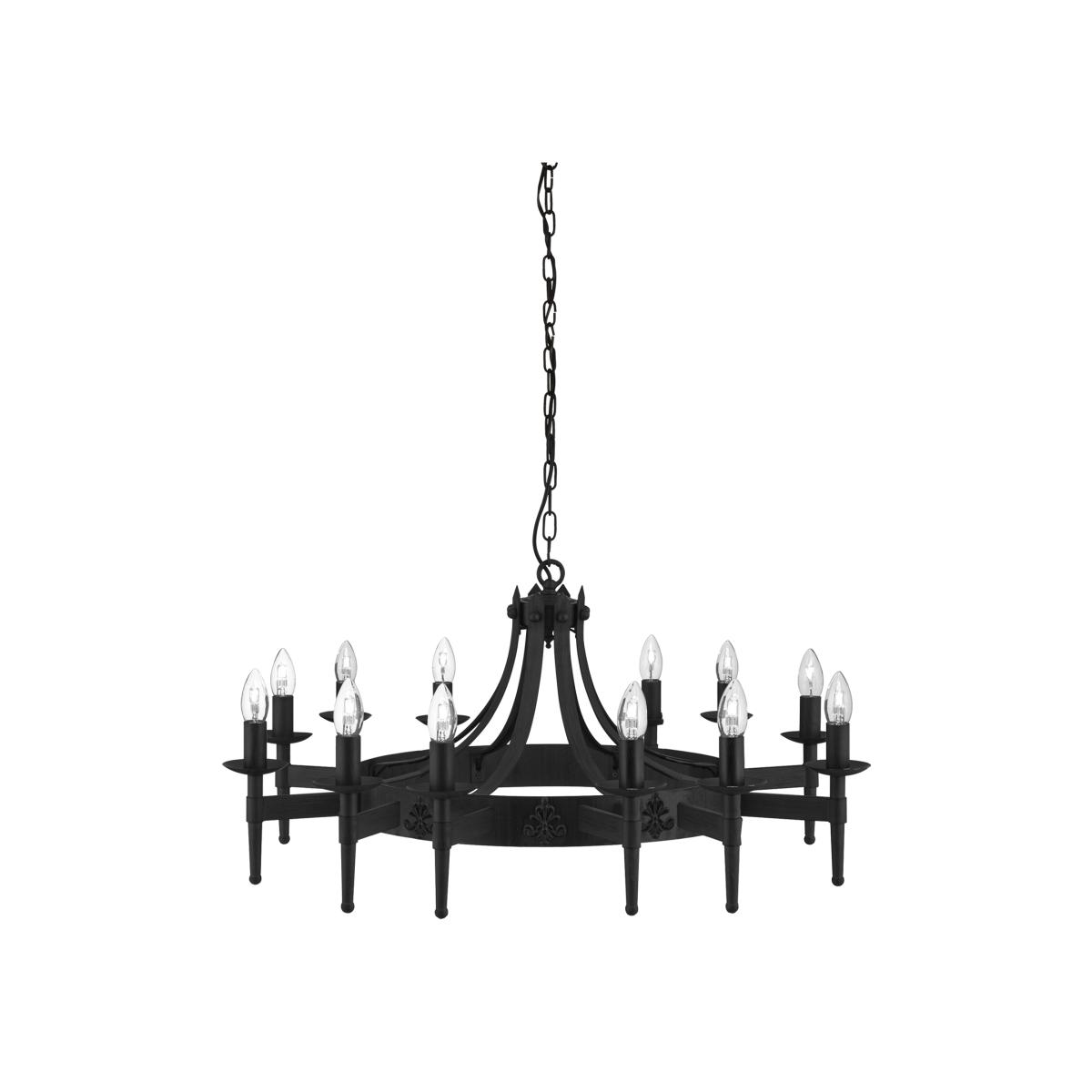 This majestic Cartwheel II 12 light pendant in black wrought iron will give any bedroom, living room, dining room or kitchen ceiling a look of the old world. The wrought iron pendant is Gothic in style, and the twelve candlestick lampholders create a warm source of light. Height adjustable, this pendant can be altered to suit the ceiling height needed, and this pendant will look particularly strong hung lower over a dining table to create a warm ambiance.