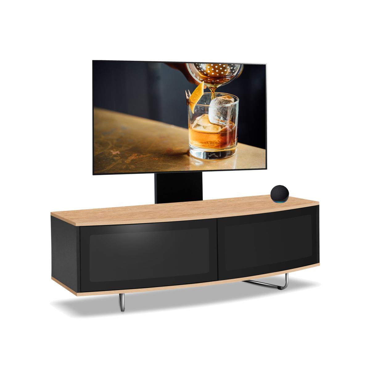 The new contemporary "D" Shaped Caru TV cabinet is ideal for LED, LCD and OLED TV screens. Suitable for 32"-65" flat-screen TVs, the Caru TV stand has ample space for storing home cinema systems, Blu-Ray player, Sky/Virgin/BT receivers, digital boxes and games consoles. Combining safety with style, the Caru cabinet has toughened safety glass shelves and Beam-thru remote friendly doors, allowing you to use your remote control through the closed doors. The best feature of the Caru TV cabinet is the compatibility with the Screen Mounting Arm that transforms the cabinet into a cantilever style system to give your TV a floating appearance. The Caru TV cabinet also features cable management to hide unsightly wires at the rear, and clear and concise manual for easy self-assembly.
