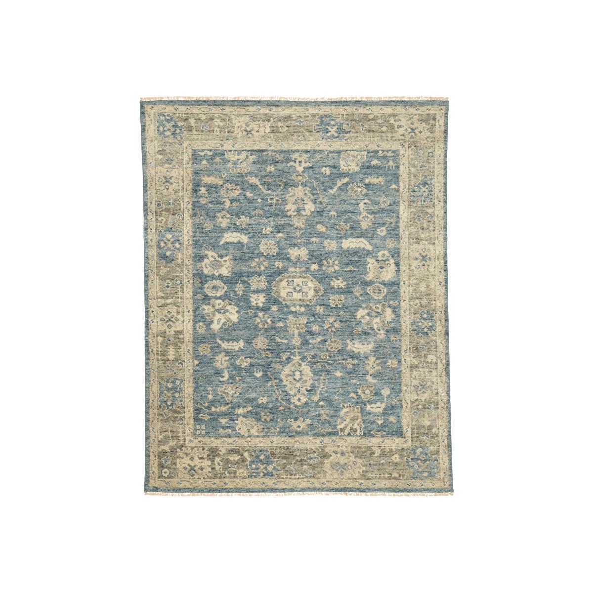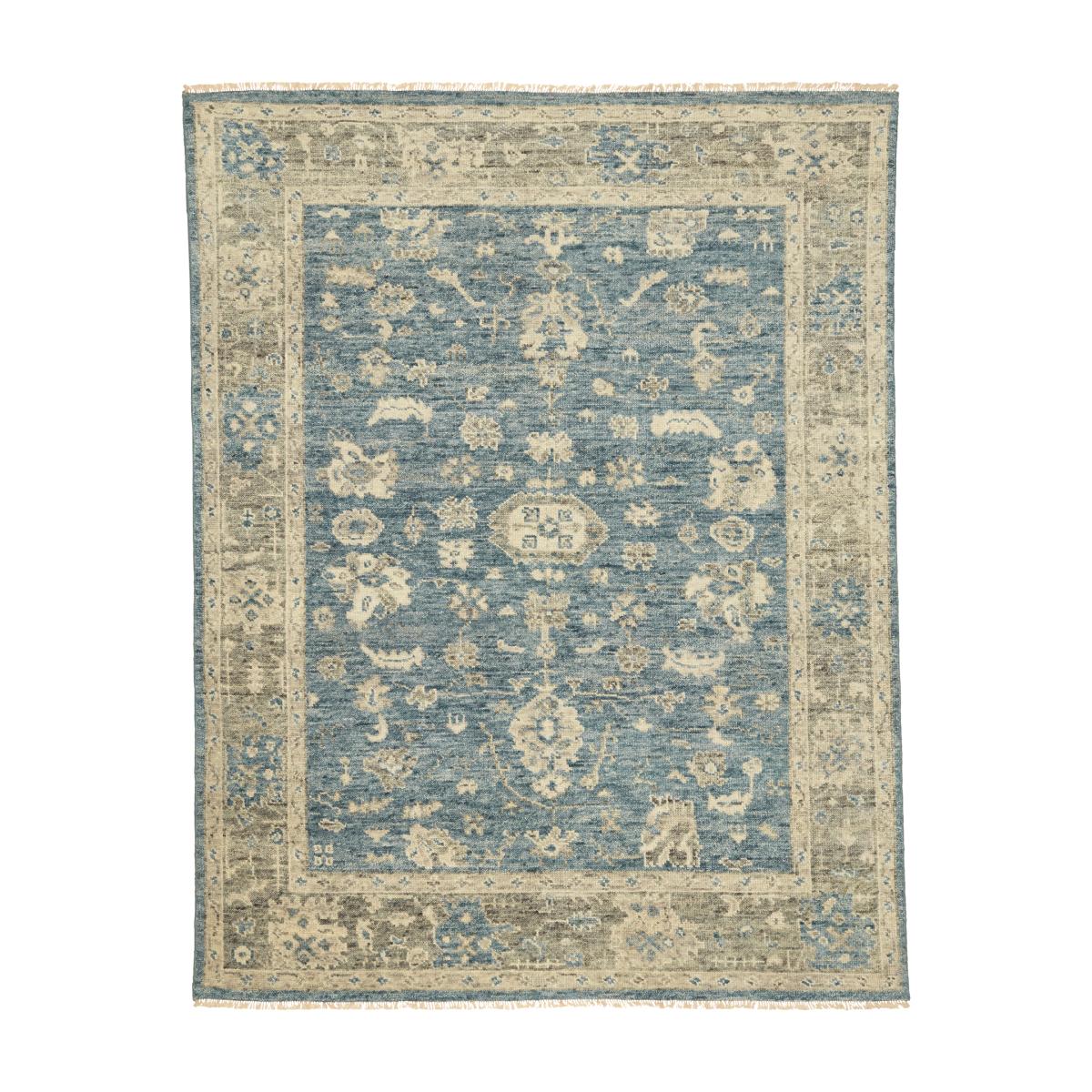 Crafted entirely by hand, the Carulea Rug's bordered abstract floral design references traditional Persian-style floor coverings. Created in subtle tones, the hand-knotted decorative crosses, leaves, and flowers bring an understated sophistication to a sitting room floor.