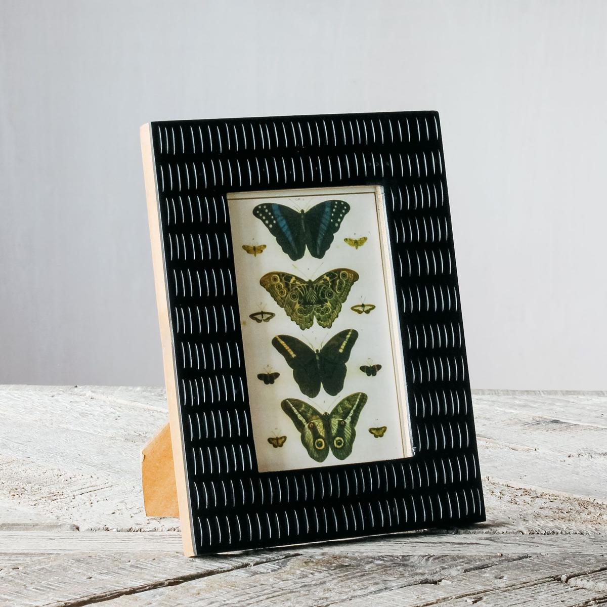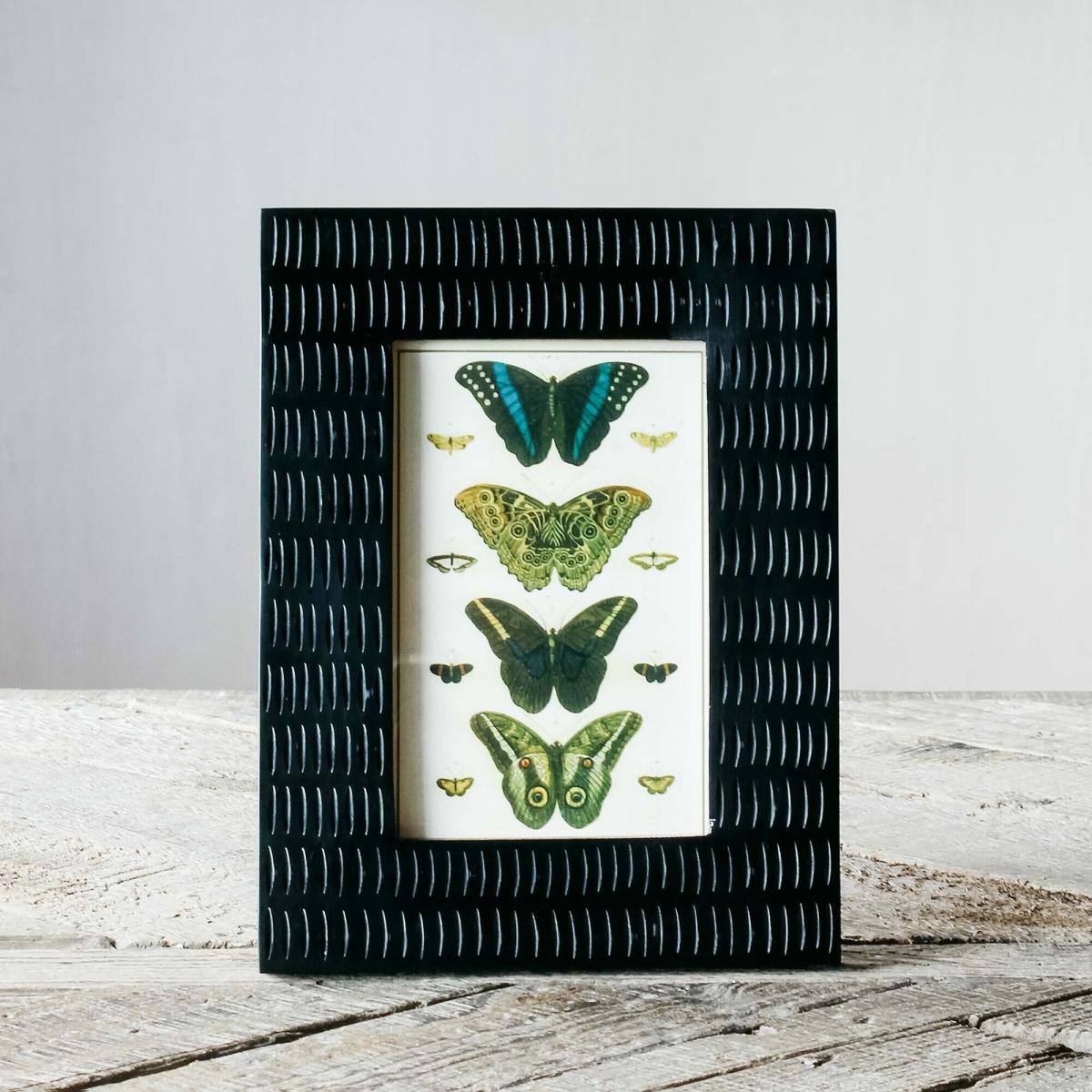 I love how the black frame adds a bold, modern touch that works well in both contemporary and eclectic interiors. Its simplicity allows the artwork of butterflies to stand out, making it a versatile piece that can sit comfortably on a sideboard, mantel, or gallery wall. For styling, consider pairing it with other frames that have matte finishes or natural materials to create a layered, curated look. It’s also worth playing with scale-using it alongside larger or smaller frames can add visual interest and keep the overall presentation cohesive. This frame is particularly effective in spaces with neutral tones or monochrome palettes, where it can act as a striking focal point.