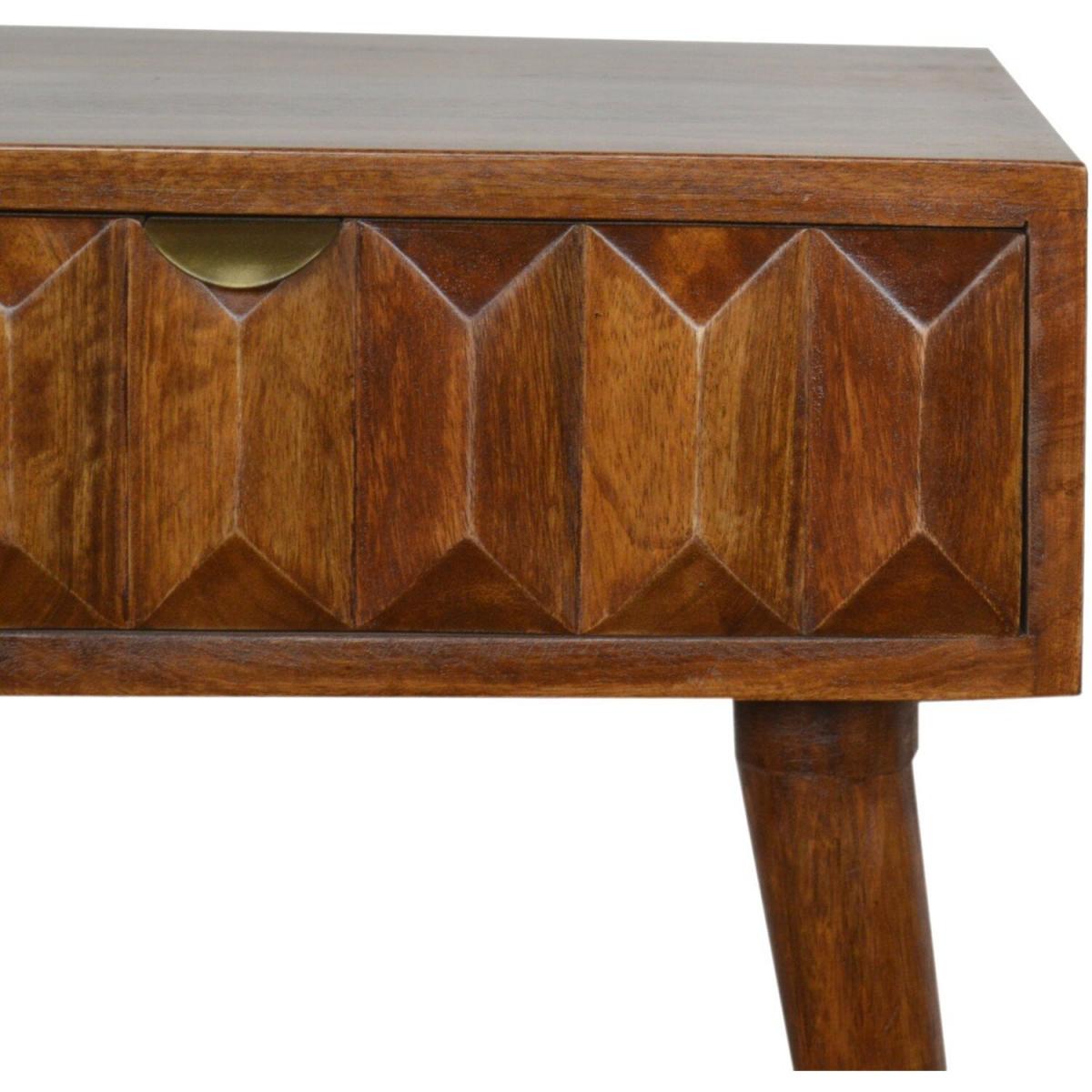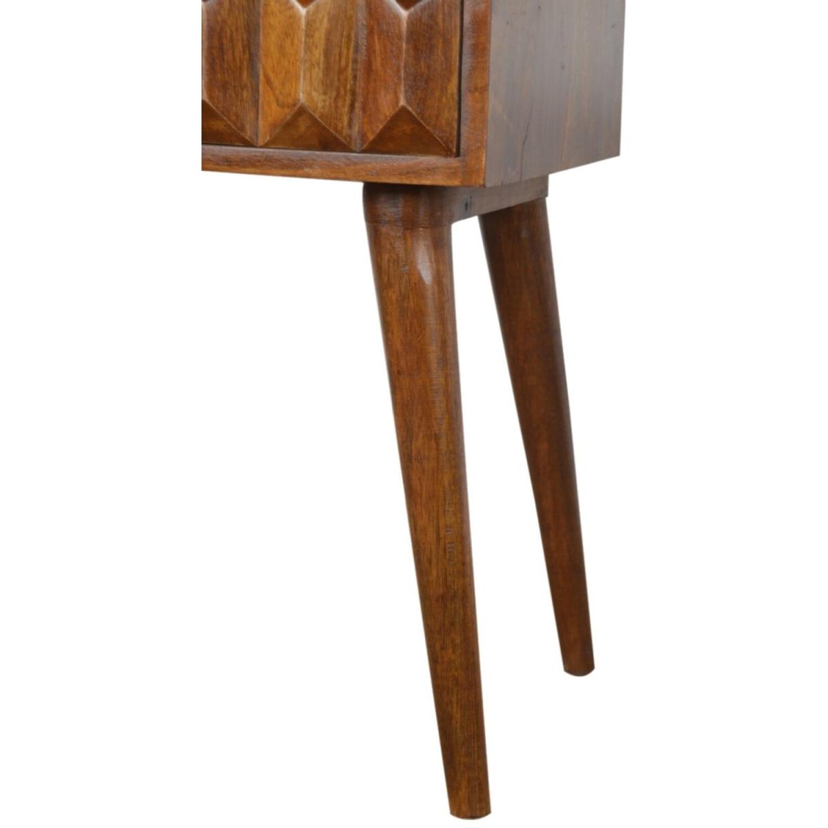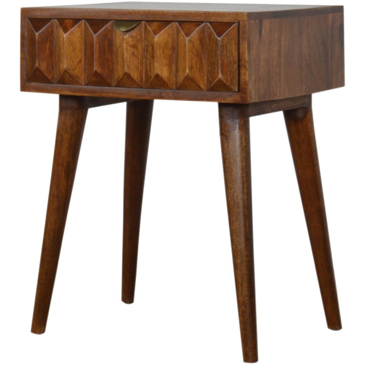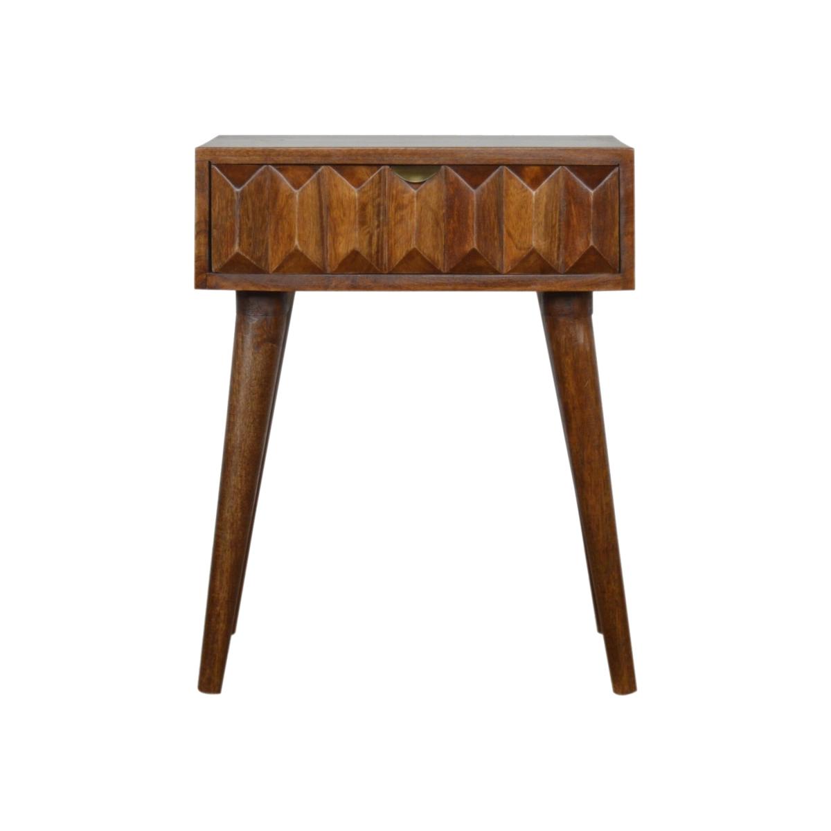 Enjoy the beauty of this bedside in your bedroom, constructed from 100% solid wood in a chestnut finish. It features 4 Nordic style legs and one deep drawer to take care of everyday utility items. The main feature is the hand carved raised pyramid drawer front which is bound to add a nice touch and lasting character to your home.