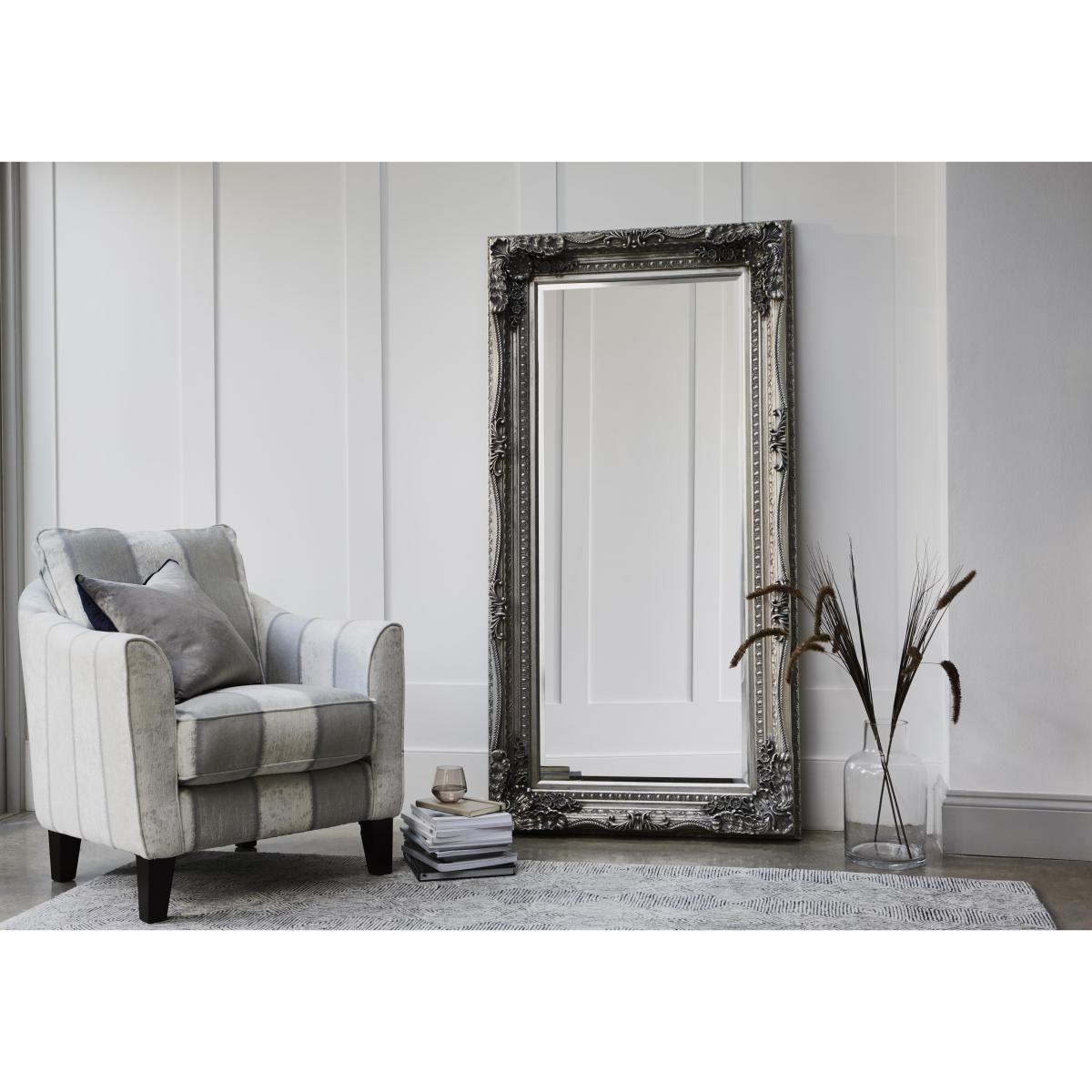 This beautiful Baroque style framed mirror will add elegance to any room. It is meticulously designed and beautifully crafted with a leaf embellished wooden frame painted either silver or cream. This opulent ‘leaner’ mirror suits both the classic and contemporary home. Lavish mirror opulently decorated in the Baroque style. Wooden frame embellished with leaf designs. Silver or cream painted finish. Hang portrait or landscape. Can lean against a wall. Fabulous in bedroom, hall, bathroom or living room. Dimensions. Width: 90cm (36 inches). Depth: 10cm (4 inches). Height: 176cm (70 inches).