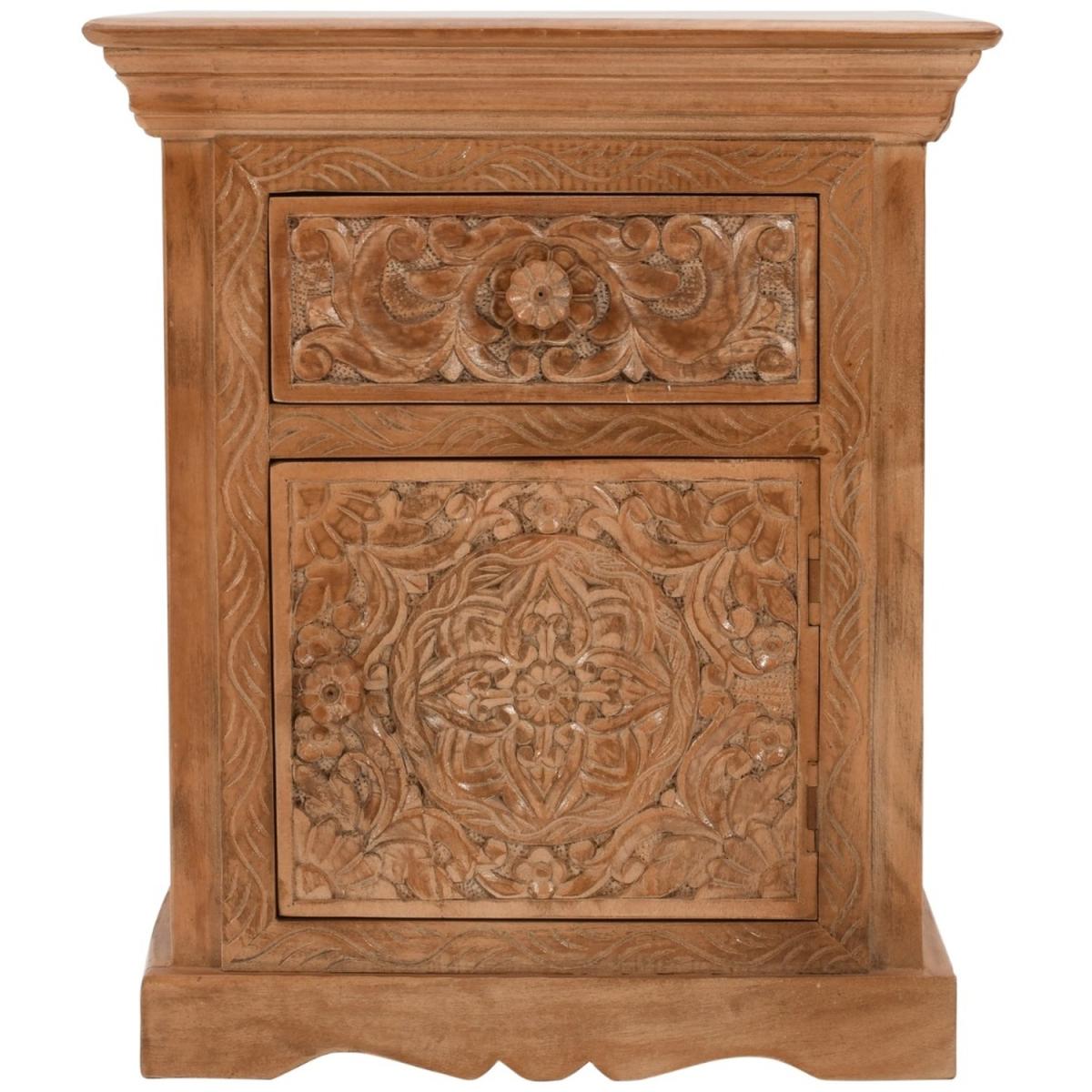 Carved Mango Wood Bedside Table With Storage - Brown