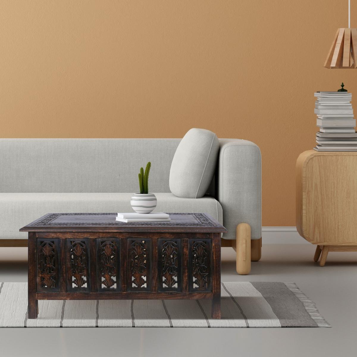 Elegant and beautifully made in India by traditional craftspeople. It comes in a stained brown antiqued effect. It has carving on the top of the table and the baselegs are covered with Jali design carving. Easy to assemble, no tools required. Instructions If you flip the top part over, ie underneath, you will see little bits of wood on opposite sides which are screwed in. These rotate outward when moved. If you then turn the legs upside down, you will see that two opposing sides have grooves cut out. This is where the two little bits of wood rotate or swivel belonging to the top. When lined up with the legs apart, they lock into place. It works better if you assemble it on the floor, top upside down, line up the leg notches with the rotating pieces, let the legs click into place outside the rim from the upended top, and rotate the bits into place to connect with the upended top you should have the connection and a table is assembled.