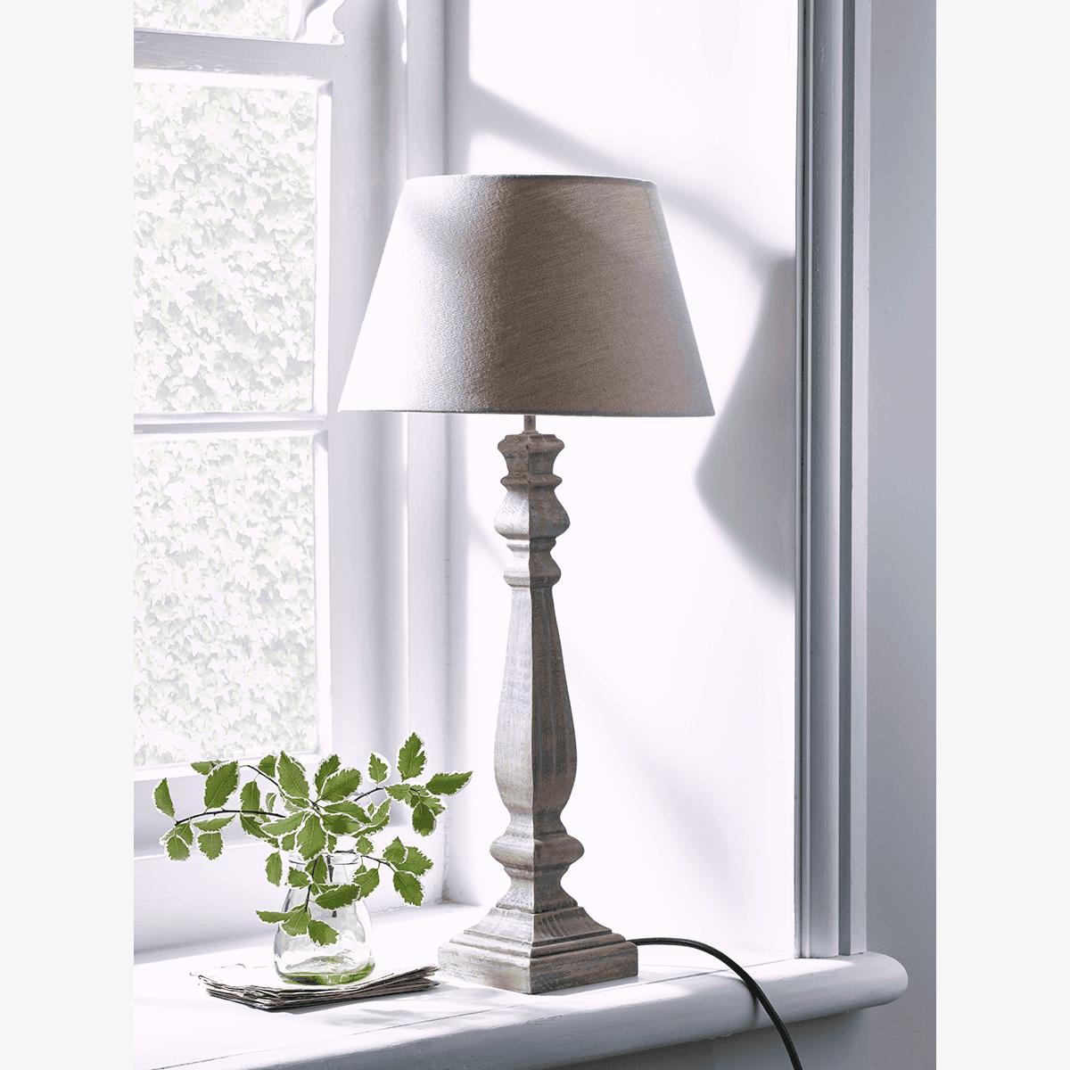 With a limewashed, elegantly carved base and natural cotton shade, our table lamp will work beautifully with most styles of interior. Complete with a squared foot, the base has a visible wood grain, which adds character.