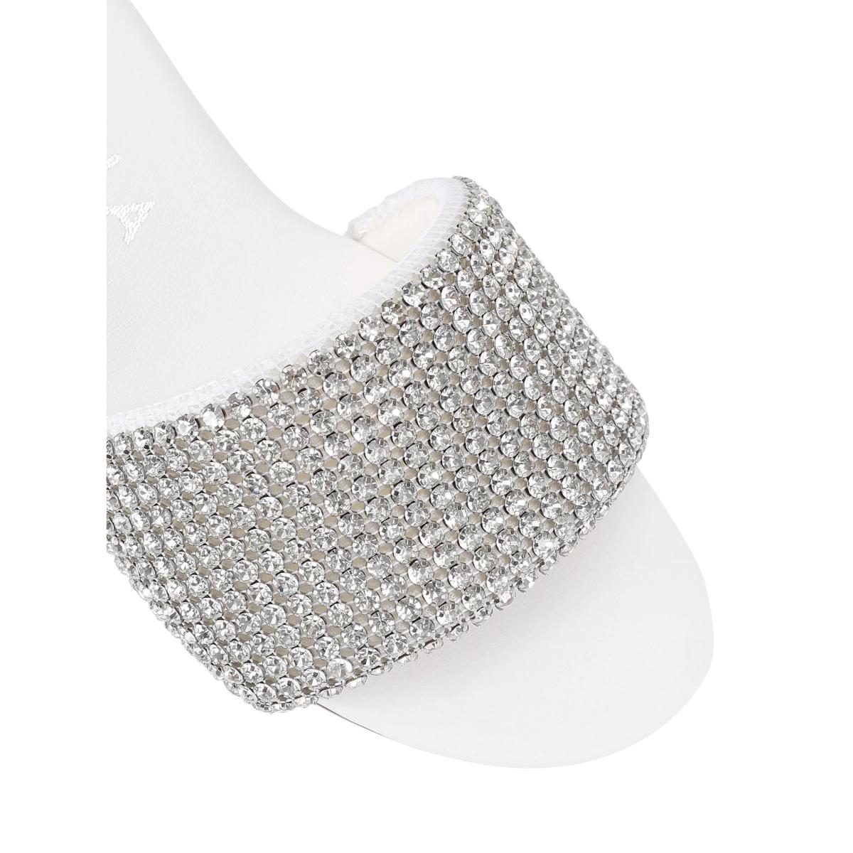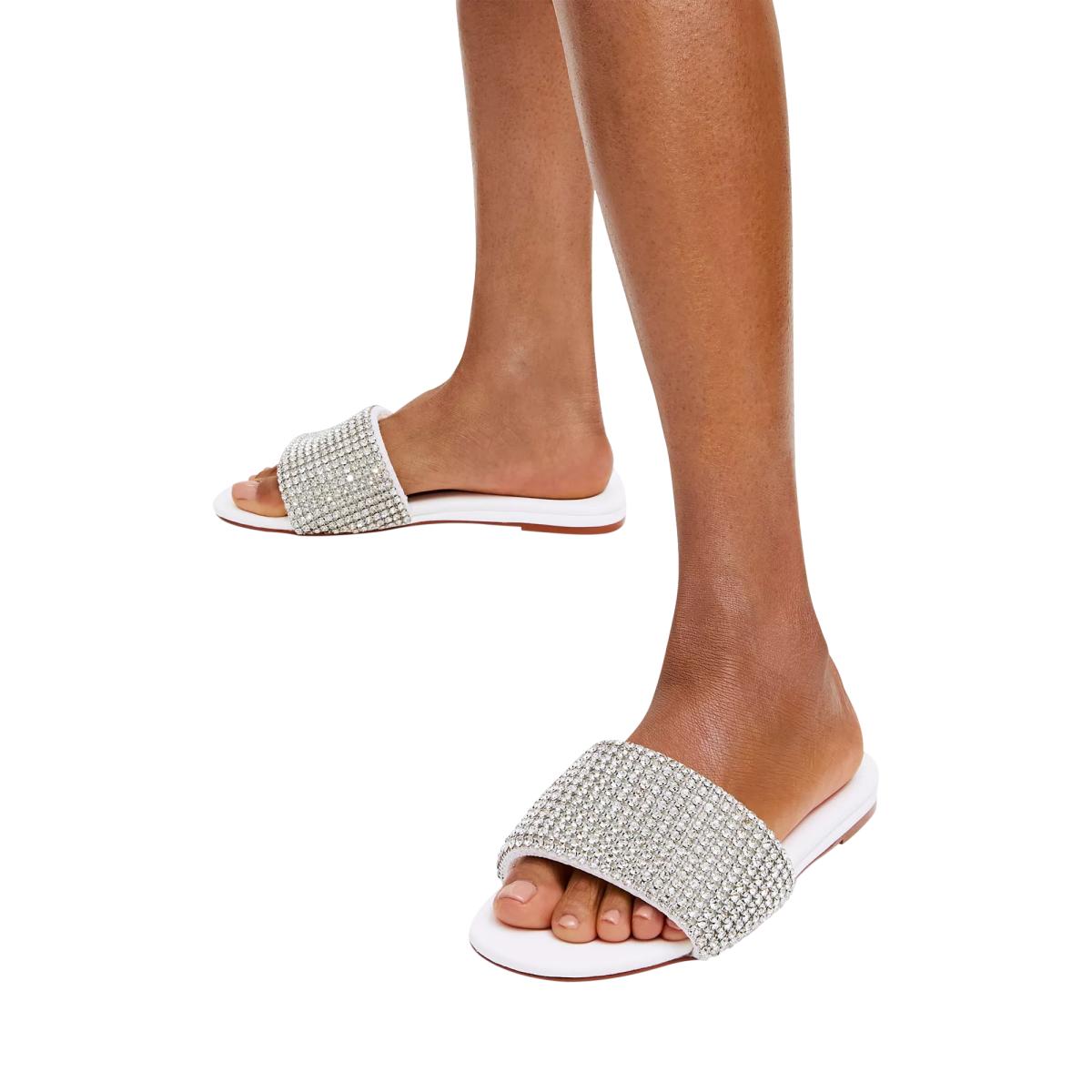 The Spotlight is a slip-on sandal with a wide-toe strap embellished with large crystals. Finished with a padded footbed to add comfort to this glamorous design.