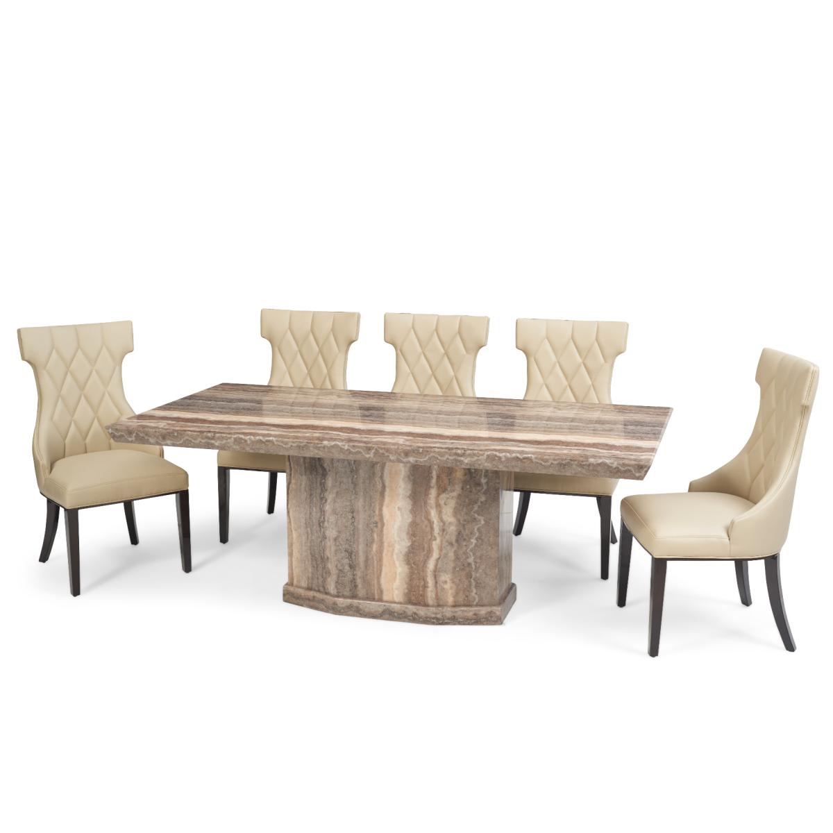 Carvelle 160cm Brown Pedestal Marble Dining Table with 4 Cream Sophia Chairs
