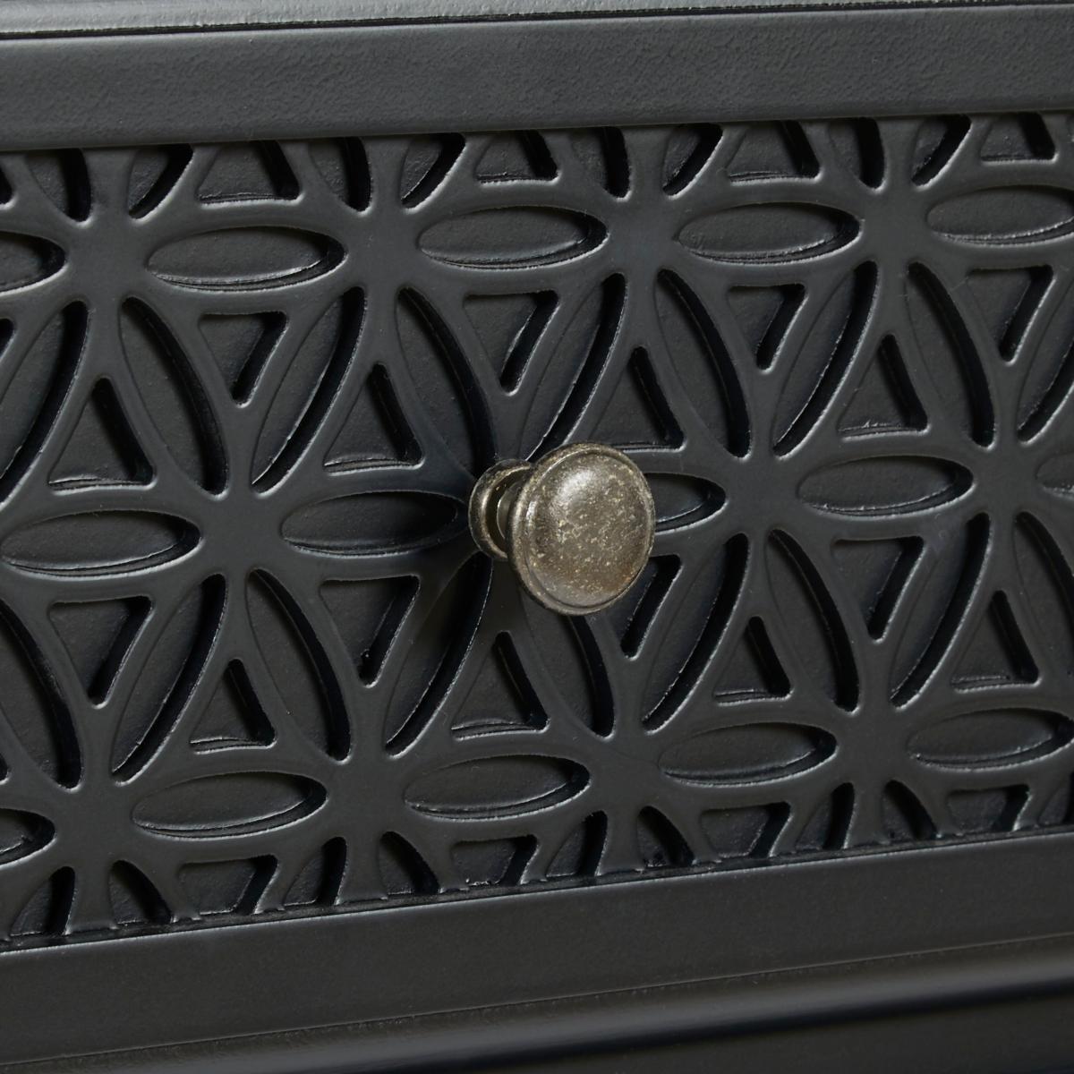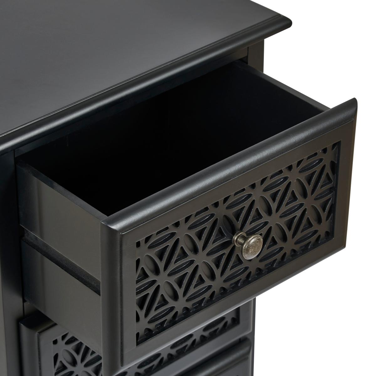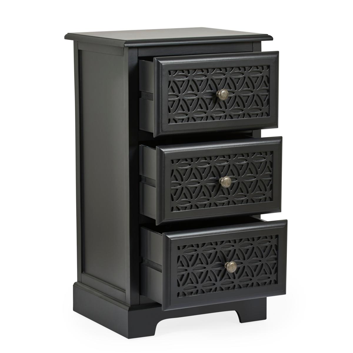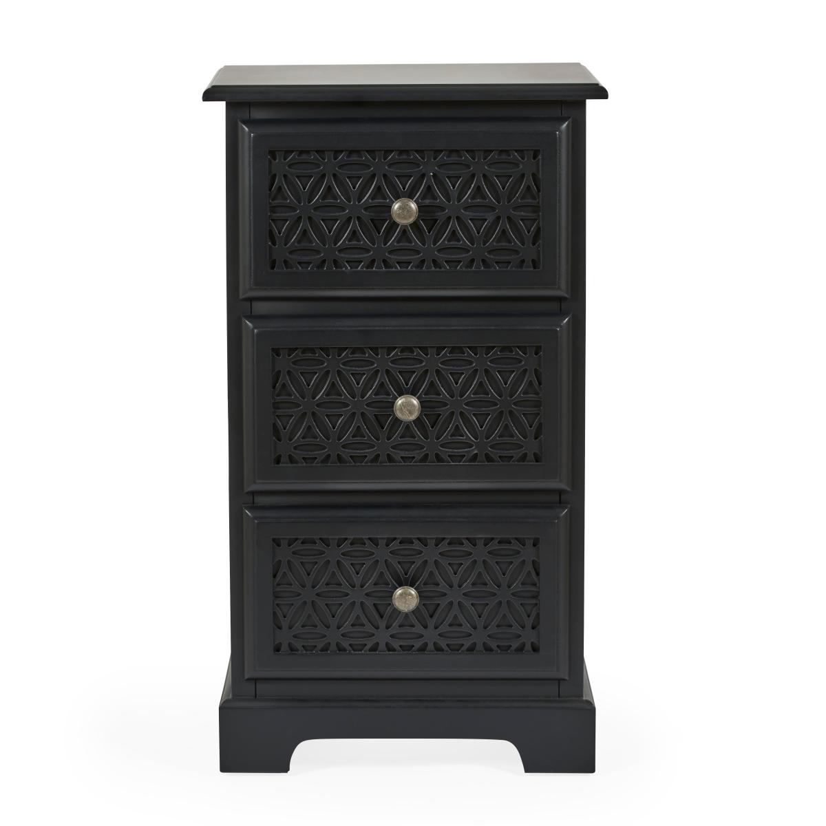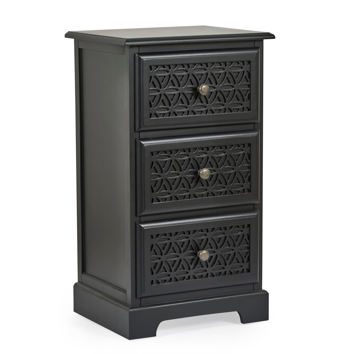 Dunelm Exclusive - Designed and Developed by Dunelm. The Carys Black 3 Drawer Bedside is perfect for adding a classy touch to your bedroom. This beautiful piece features stunning carved design on the drawer fronts and also boasts a clean, black painted finish. This bedside is complete with distressed brass look handles for a stylish look. When fully assembled, the elegant Carys bedside table features three spacious drawers and would make a stylish addition to your bedroom.