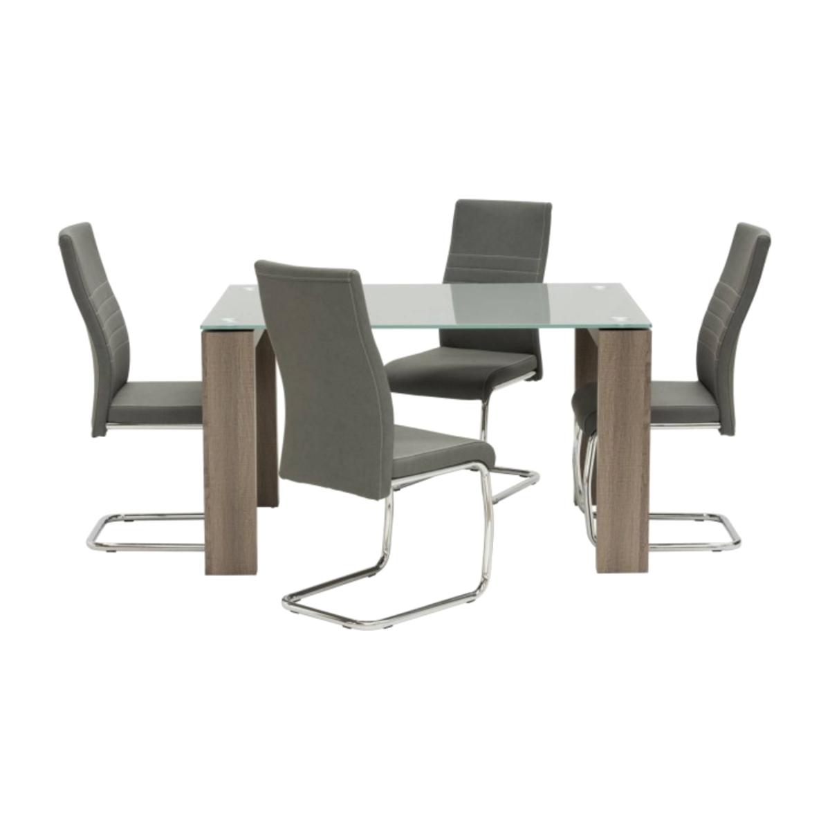 Modern dining set featuring an elegant grey glass table with 4 grey chairs. The Casa Dining Set boasts a classic and simple design, perfect for updating any contemporary living space. A modern matt grey, robust tempered glass tabletop rests upon french rustic grey oak leg frames. Completing this highly stylish design is 4 polished chrome cantilever chairs finished in a very popular matt grey patina faux leather with contrasting white stitching on the seat pad and backrest. This dining table and chair set is one which is perfect for kitchens, living rooms or dining rooms boasting contemporary home decor.