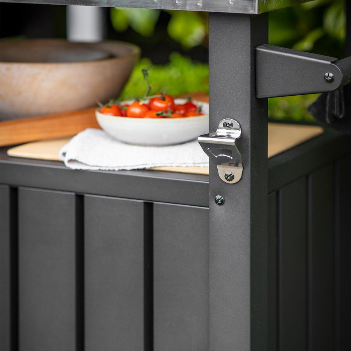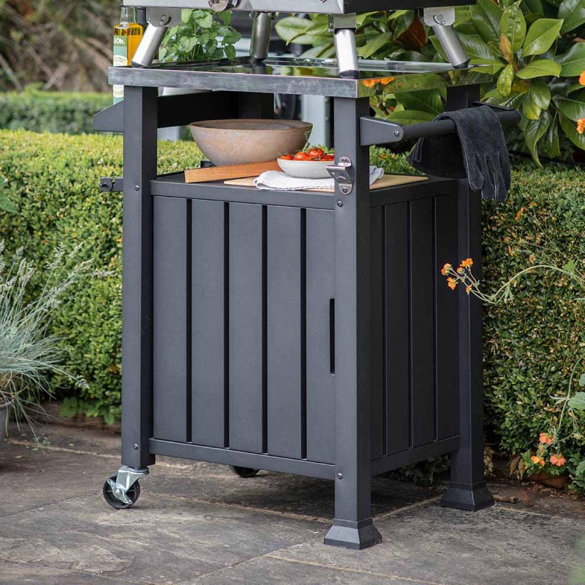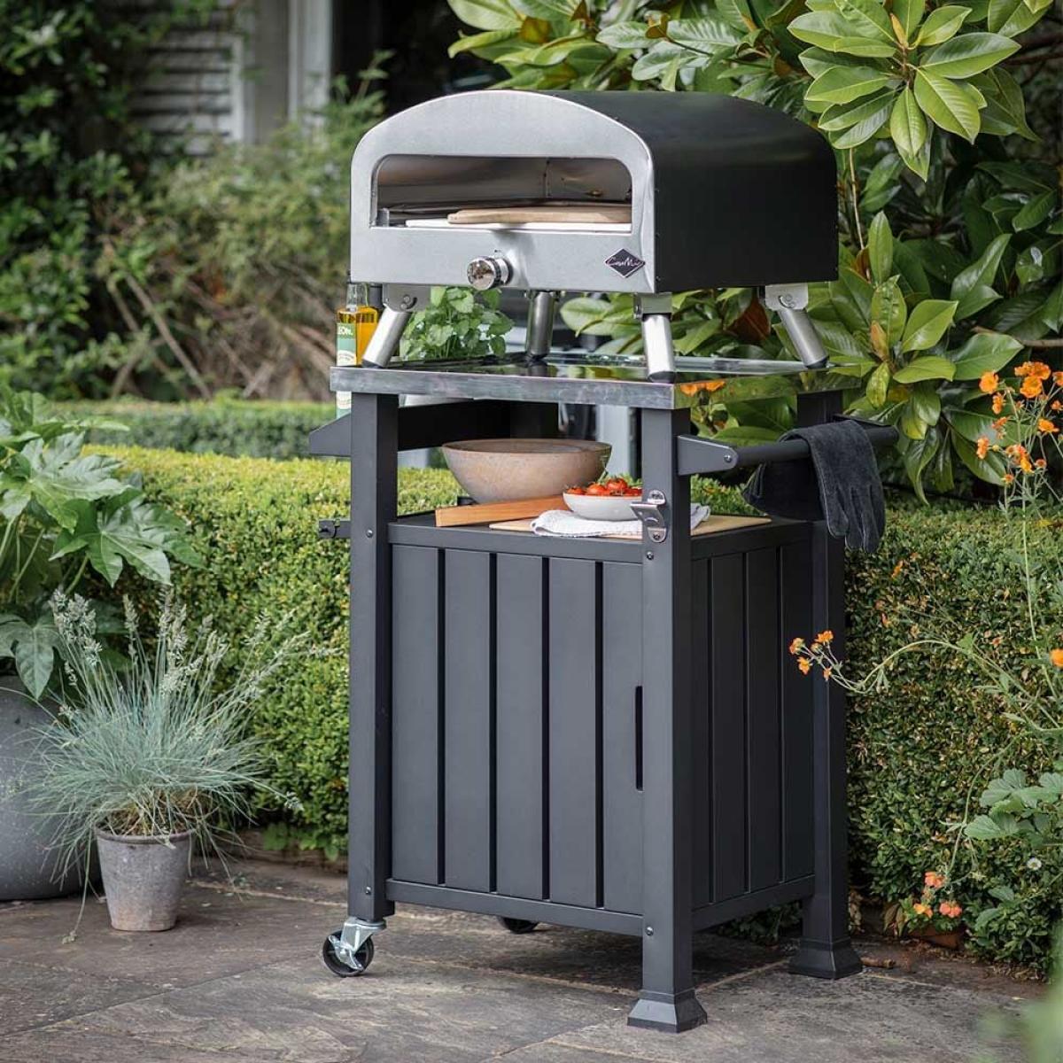 Make the most of your tabletop space with this specially designed pizza oven storage trolley. In graphite grey aluminium with a stainless steel top, this sturdy pizza oven table will give your garden the outside kitchen look. The Casa Mia pizza trolley has space for either a 12" or 16" Casa Mia pizza oven and is equipped with tool hooks, condiment rack, paper towel holder and bottle opener. It's super practical, with wheels to help you move it from one side of your patio to the other, and a large storage cupboard underneath to hide away the gas bottle.