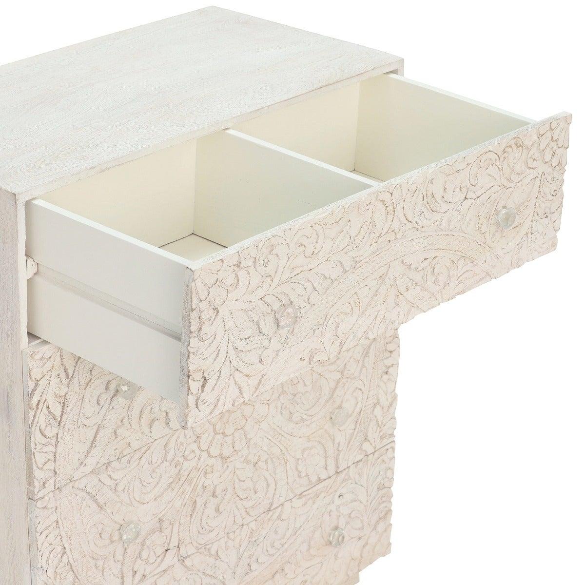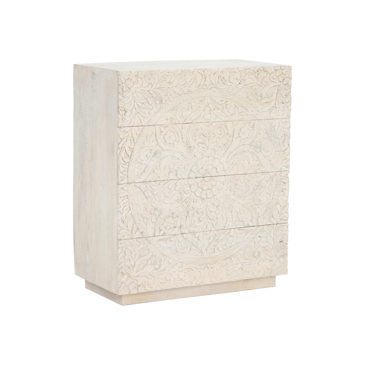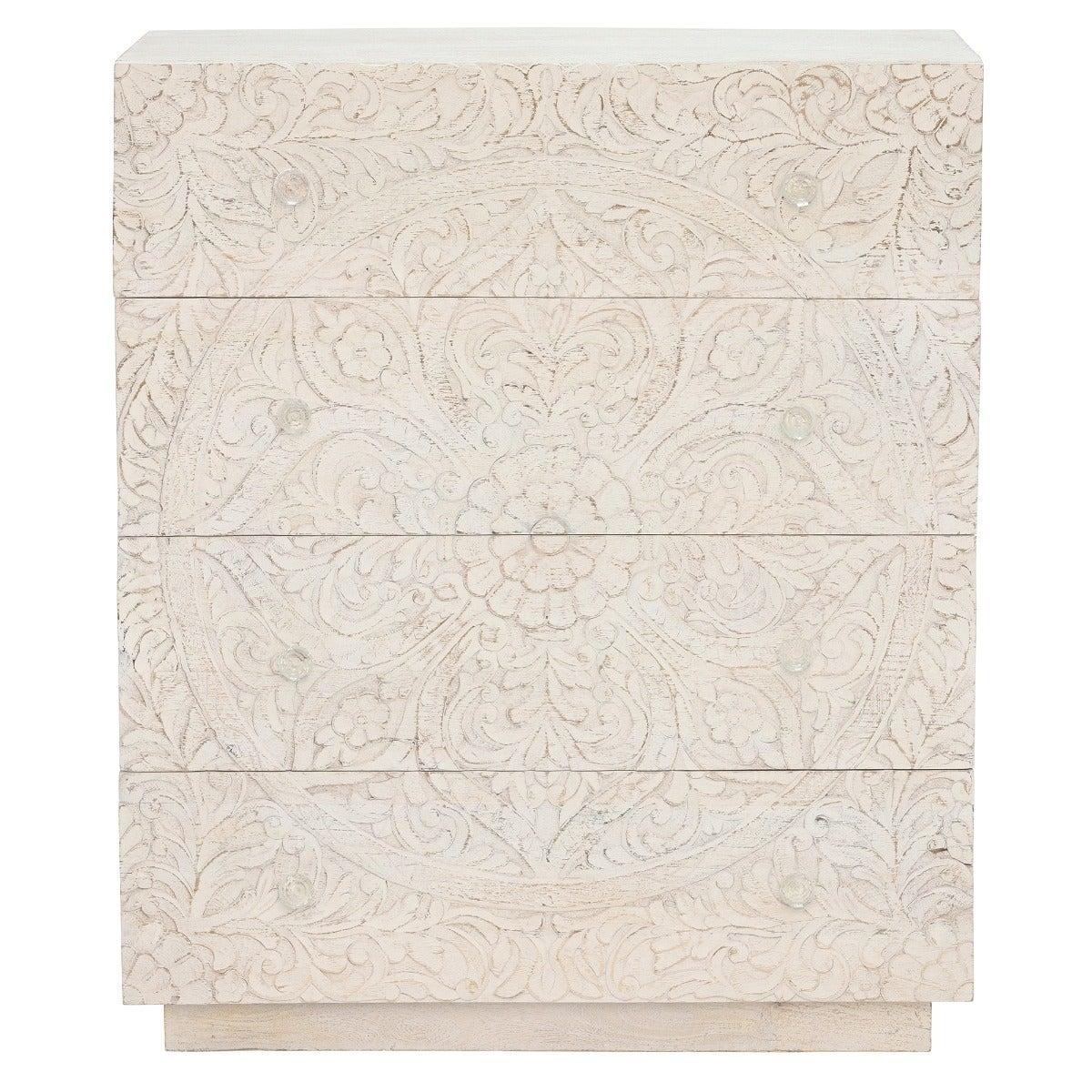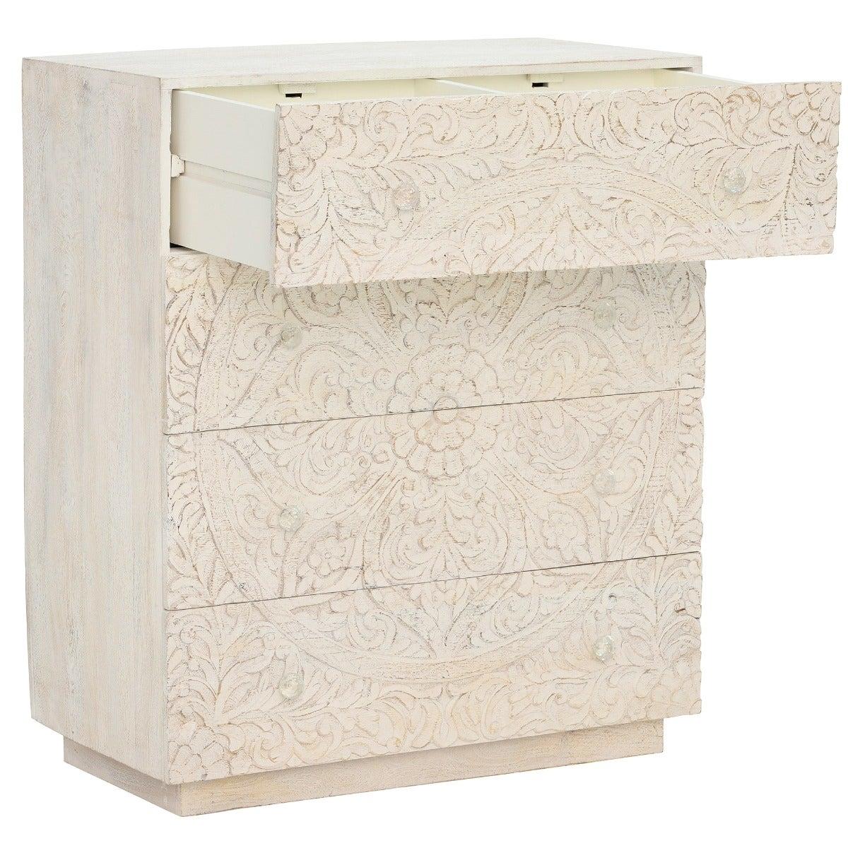 Design. No bedroom is complete without plenty of storage space for all of your clothes and accessories, making the Casablanca 4 Drawer Chest the perfect addition to your room. The rustic mango wood ensures high quality, finished in a gorgeous off-white paint to complete its bohemian feel. The elaborate yet subtle design to the front of the drawers makes the Casablanca 4 Drawer Chest one of a kind.