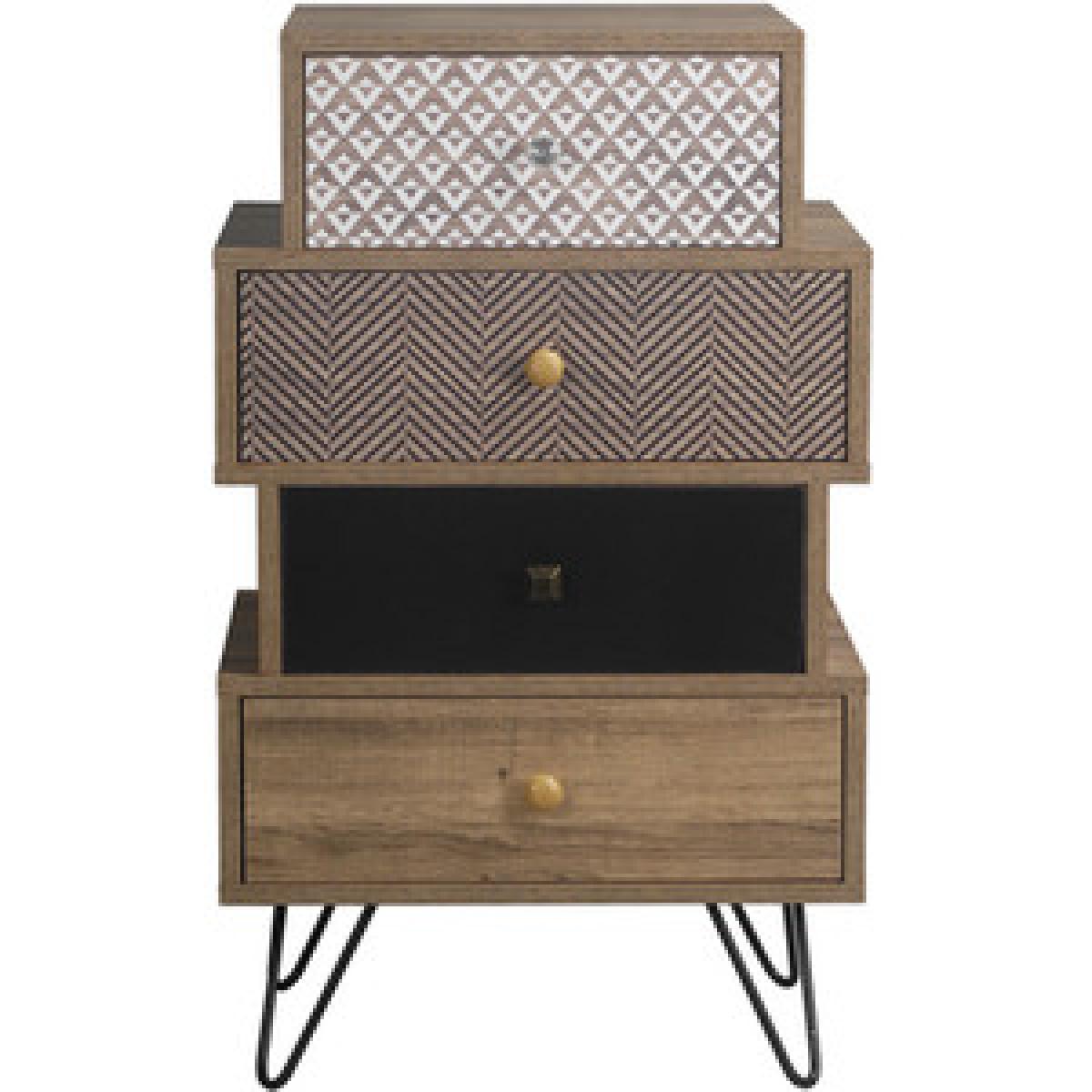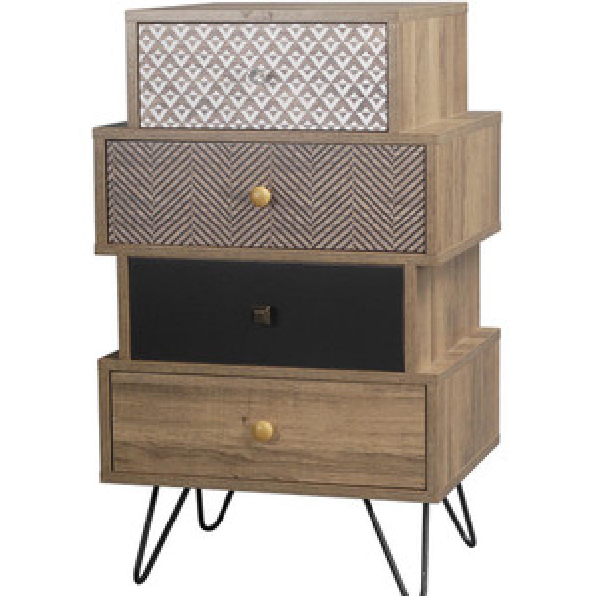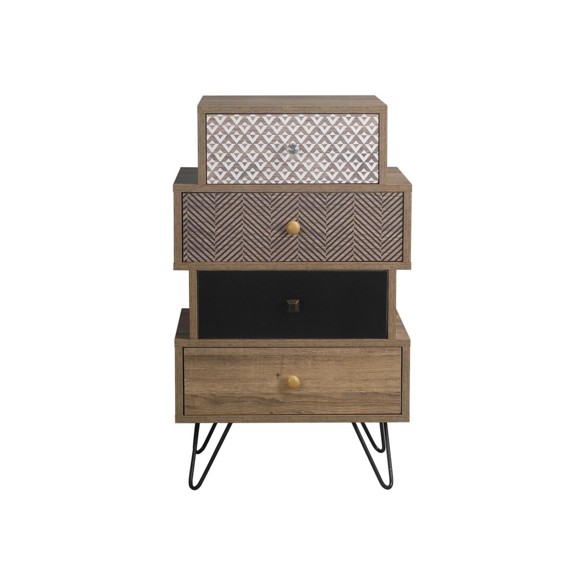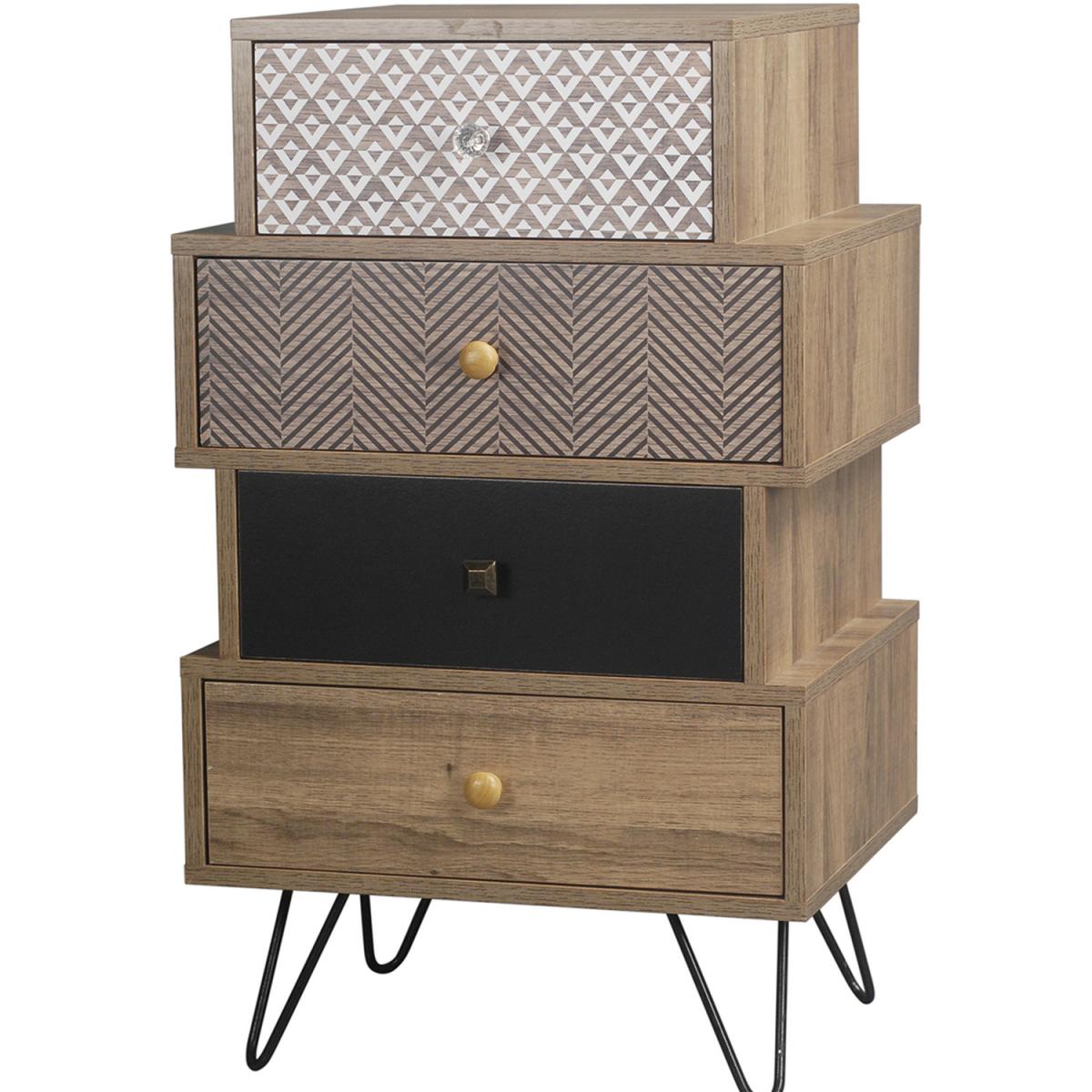 The Casablanca Four Drawer Chest consists of four drawers which are two different sizes, accessorised with handles and stands on black wired legs. The piece is constructed from particle board with a wood effect finish. The Casablanca Chest consists of foils and prints to create a quirky look to a traditional piece of furniture which adds a contemporary feel to all interior. The classic colours used in the effects means that even though the obscure design will make a stylish statement in your home, the Casablanca range will always work and will never fail to be missed by all your guests!