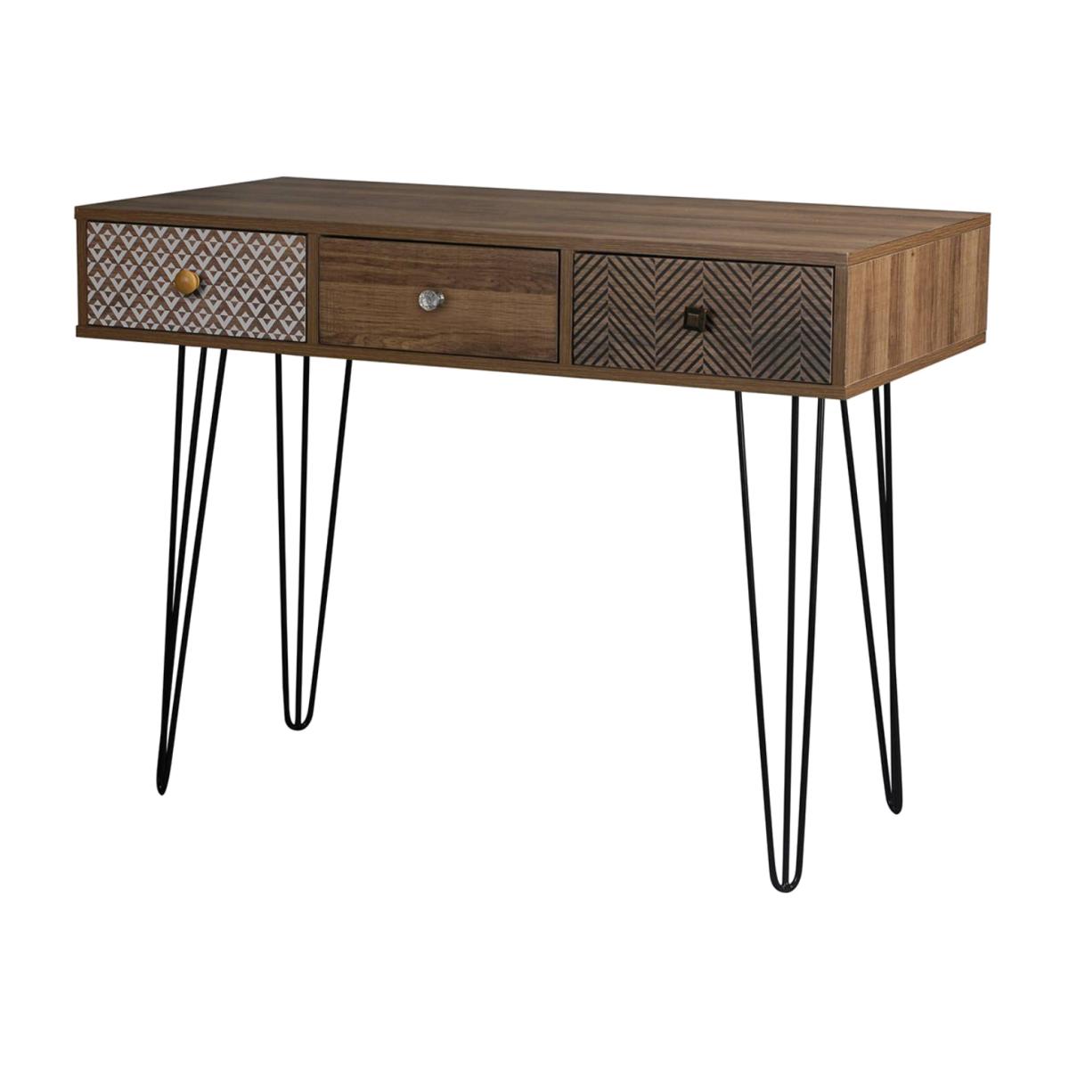 Retro Style Desk Boasting an Industrial Finish. A retro addition to your home, this statement desk is part of the Casablanca range. Composed of particle board and wood effect finish, this homely piece contains three drawers with quirky handles as well as on trend industrial style black legs. This desk is perfect for use in the office/study, or as a stylish desk in bedrooms and dining rooms. A stylish statement piece that will always be noticed!.