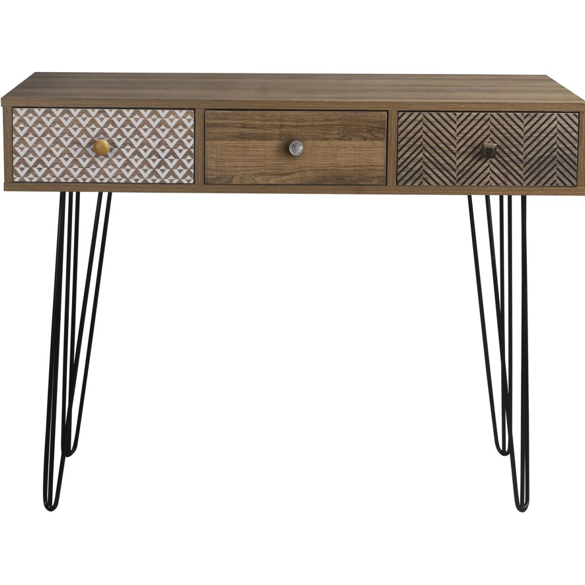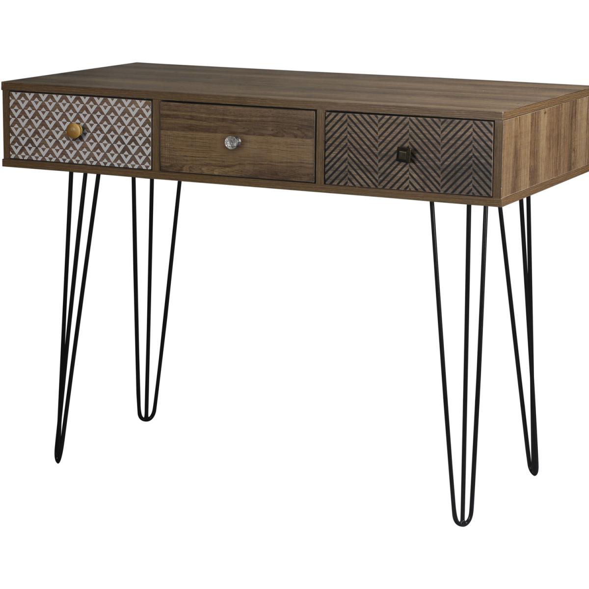 The Casablanca Desk stands on black wired legs and contains three useful drawers and a large working area perfect for all your needs. The Desk is constructed from particle board with a wood effect finish. The Casablanca consists of foils and prints to create a quirky look to a traditional piece of furniture which adds a contemporary feel to all interior. The classic colours used in the effects means that even though the obscure design will make a stylish statement in your home, the Casablanca will always work and will never fail to be missed by all your guests!