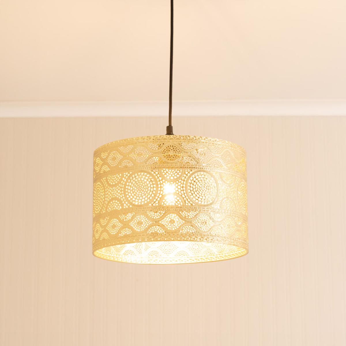 The Casablanca easy fit pendant shade in gold oozes old world glamourous charm, ready to add elegance to any space. Designed to easily fit any standard pendant ceiling light, the patterns from the intricate cutout details creates an eye-catching lighting effect. A sophisticated pendant shade with a beautiful cutout pattern and a gold finish. Fits any standard pendant lamp. A detailed design gives this gold pendant shade a glamorous feel and a beautiful lighting effect. The perfect finishing touch to add sophisticated style. A dazzling addition to any kitchen, living room, bedroom, hallway or home office. Just make sure you've got the headroom! Requires 1 x E27 or BC bulb, max 10. W. Personalise the lighting with your choice of warm, cool and smart bulb. An easy fit pendant shade, designed to make the most of any standard pendant ceiling light without breaking a sweat.