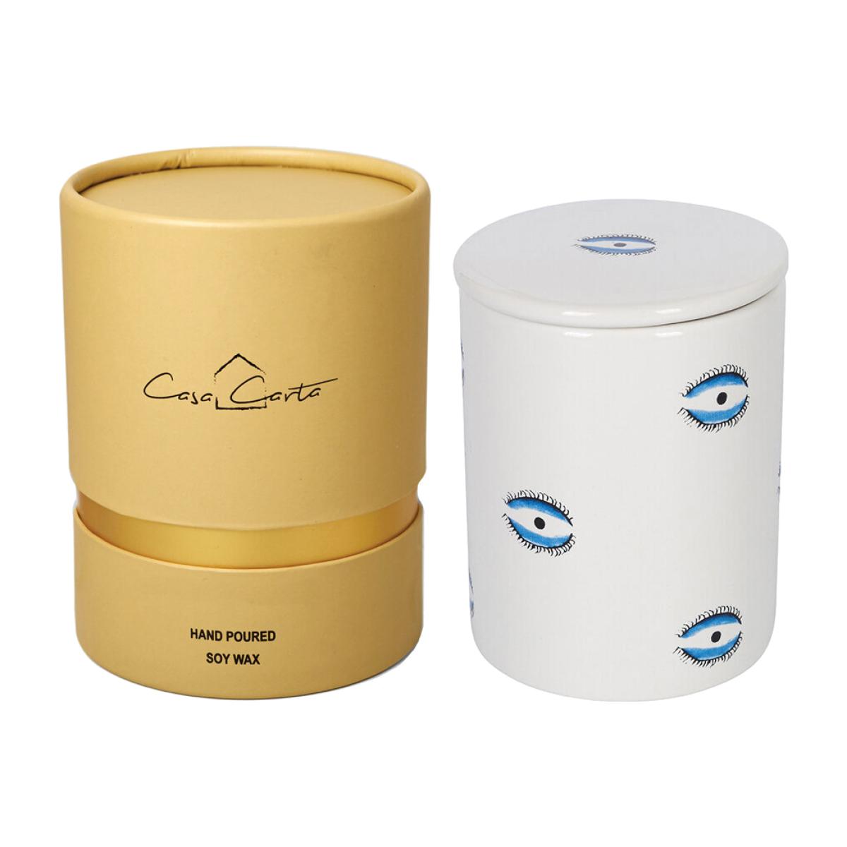 See the light with this Evil Eye candle from Casa. Carta. Made from hand poured soy wax with a beautiful white musk fragrance, this scented candle is presented in a white porcelain lidded pot, screen printed with the iconic evil eye design. Once the candle has burned, reuse the pot as a decorative accessory. Key features: * Material: soy wax, porcelain * Dimensions: H10xØ10cm * Fragrance: white musk * Burn time: 45 hours (approx.) * Hand poured soy wax * Single wick * Includes a lid which can be used as a snuffer * Evil Eye design * In white and blue tones
