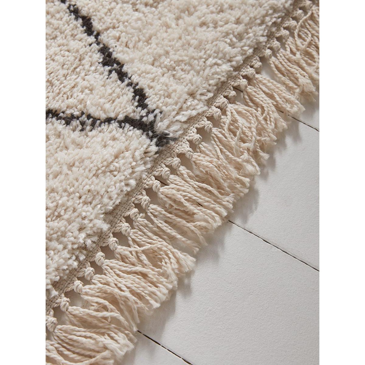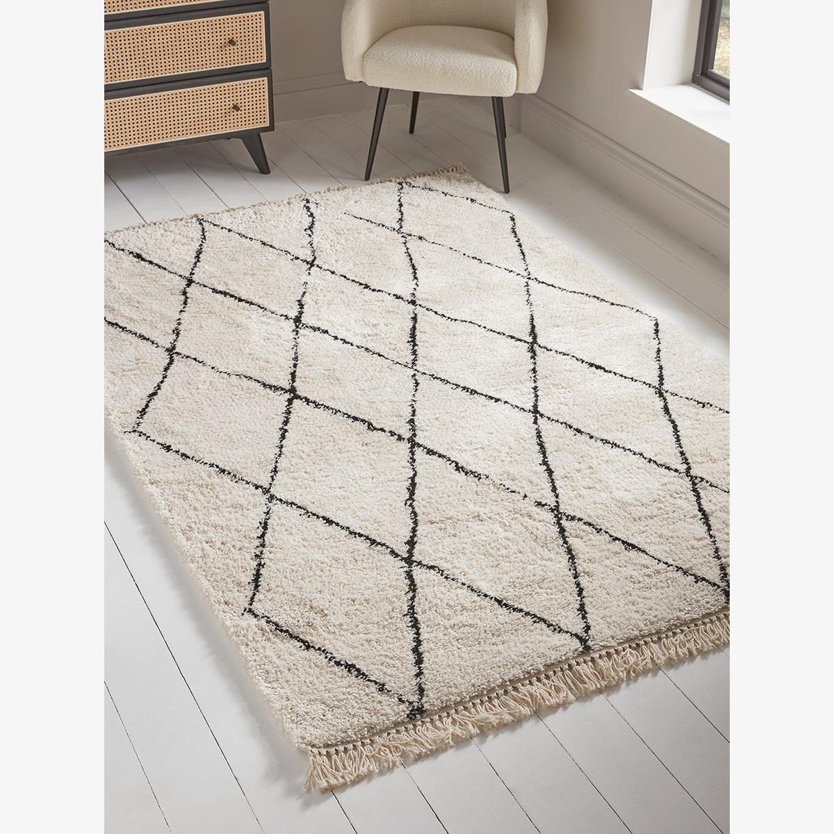 Tactile and shaggy, this Berber inspired rug features a diamond design on a warm cream background for a sharp monochrome effect. Perfect for stepping out of bed onto or in front of a sofa for a cosy look lounge. This fringed rug is available in two sizes.