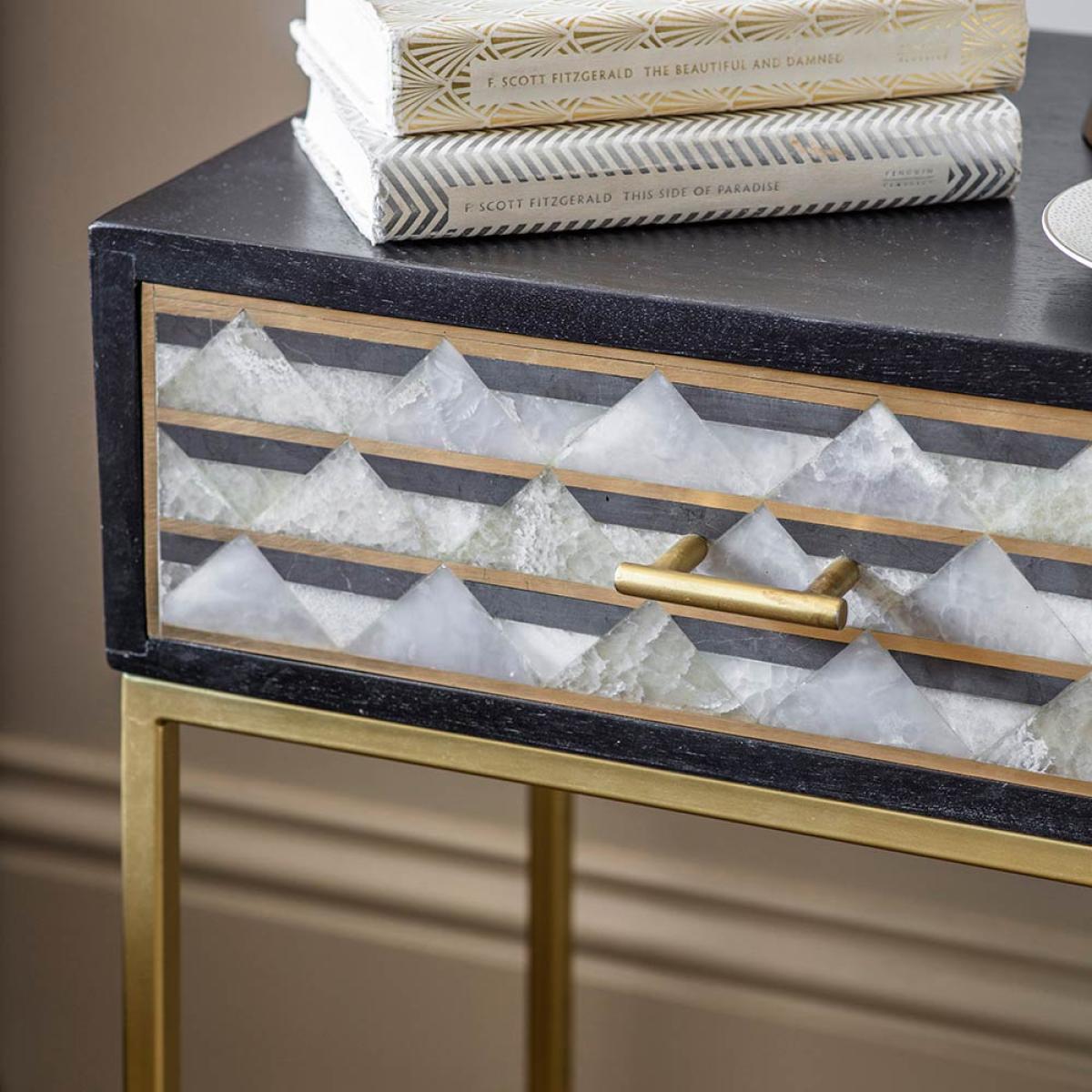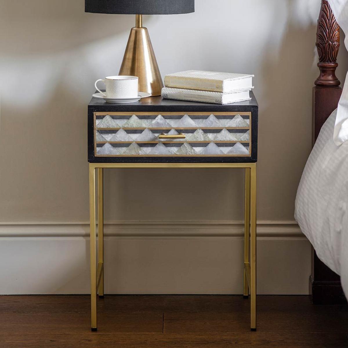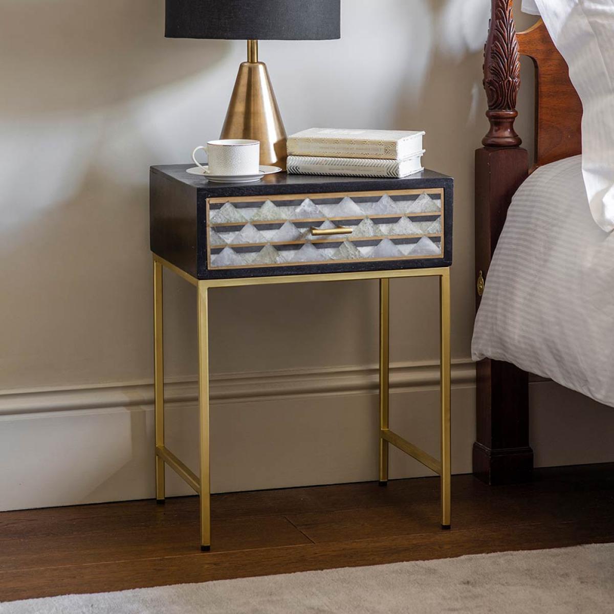 Create instant impact the minute you walk into the bedroom with our new Cascade Bedside Drawer. Its decorative black stained mango wood finish features a striking marble and brass inlay on the drawer front while the brass powder coated legs enhance the luxe look. Perfect for adding an Art Deco feel to a main bedroom or guest bedroom.