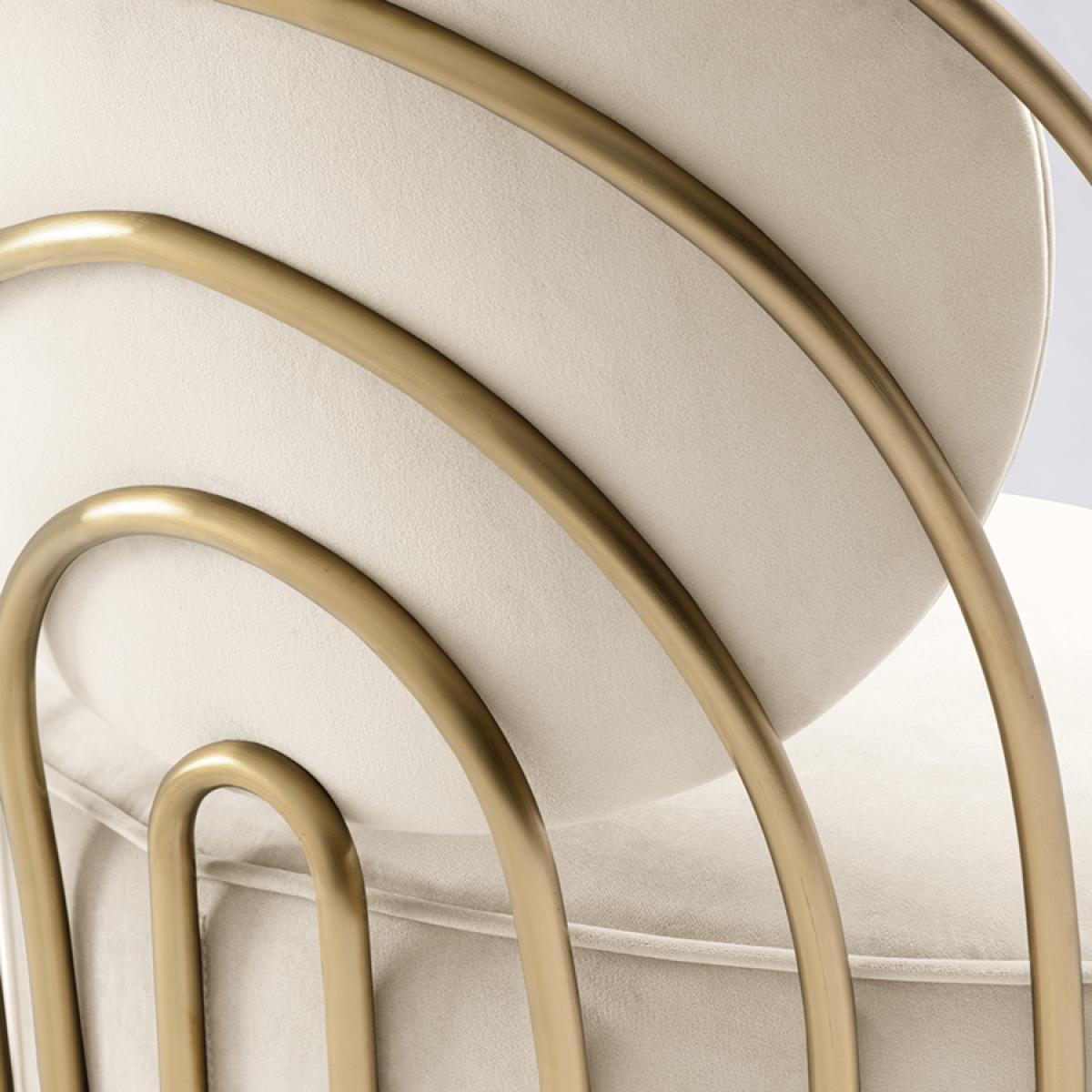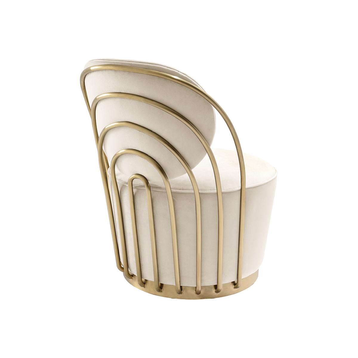 A unique, sculptural swivel chair inspired by American Art Deco Architecture and Interior Decoration. Generous, deep foam and fibre filling. Comfortable sprung seat. Curved supportive back rest. Swivel base. Velvet upholstery fabric. Brushed stainless steel frame with brass finish.