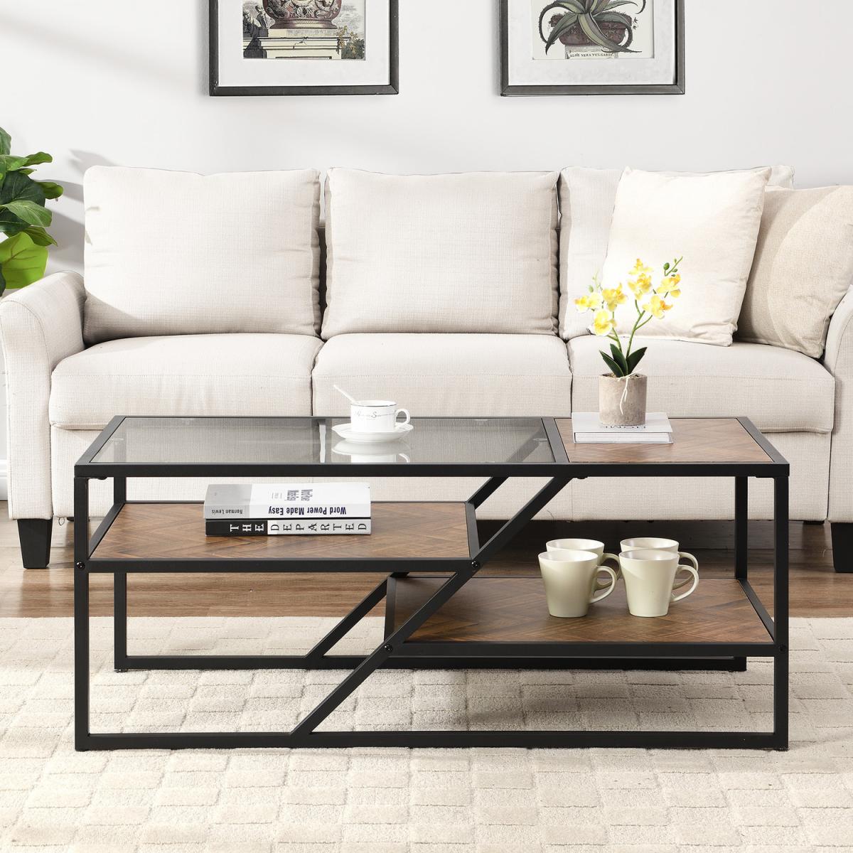 The Cascade Glass Top Coffee Table with Shelves is a sleek and functional 110cm x 55cm rectangular coffee table, perfect for modern living spaces. Its unique split glass and wooden surface offers a stylish contrast, while the wooden shelves underneath provide ample storage for books, magazines, and decor. Supported by a sturdy black powder-coated metal frame, this table combines durability with contemporary design. Whether you're entertaining guests or organizing essentials, it enhances both style and practicality. Plus, with our quick and efficient delivery, upgrading your home has never been easier.