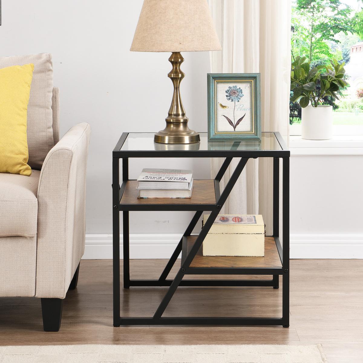 The Cascade Glass Top End Table with Shelves is a stylish and functional 55cm x 55cm square side table, perfect for modern homes. Featuring a sleek glass top and tiered wooden shelving, it offers both elegance and practicality, providing ample space for books, decor, or everyday essentials. The sturdy black powder-coated metal frame ensures durability while adding a contemporary touch to any room. Ideal for use beside a sofa or as an accent piece, this table effortlessly blends form and function. Plus, with our quick and efficient delivery, upgrading your space has never been easier.