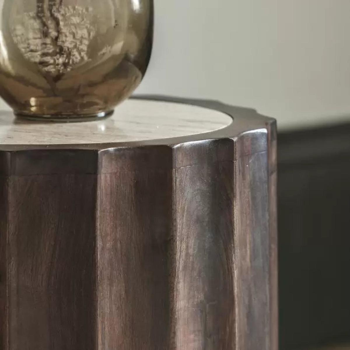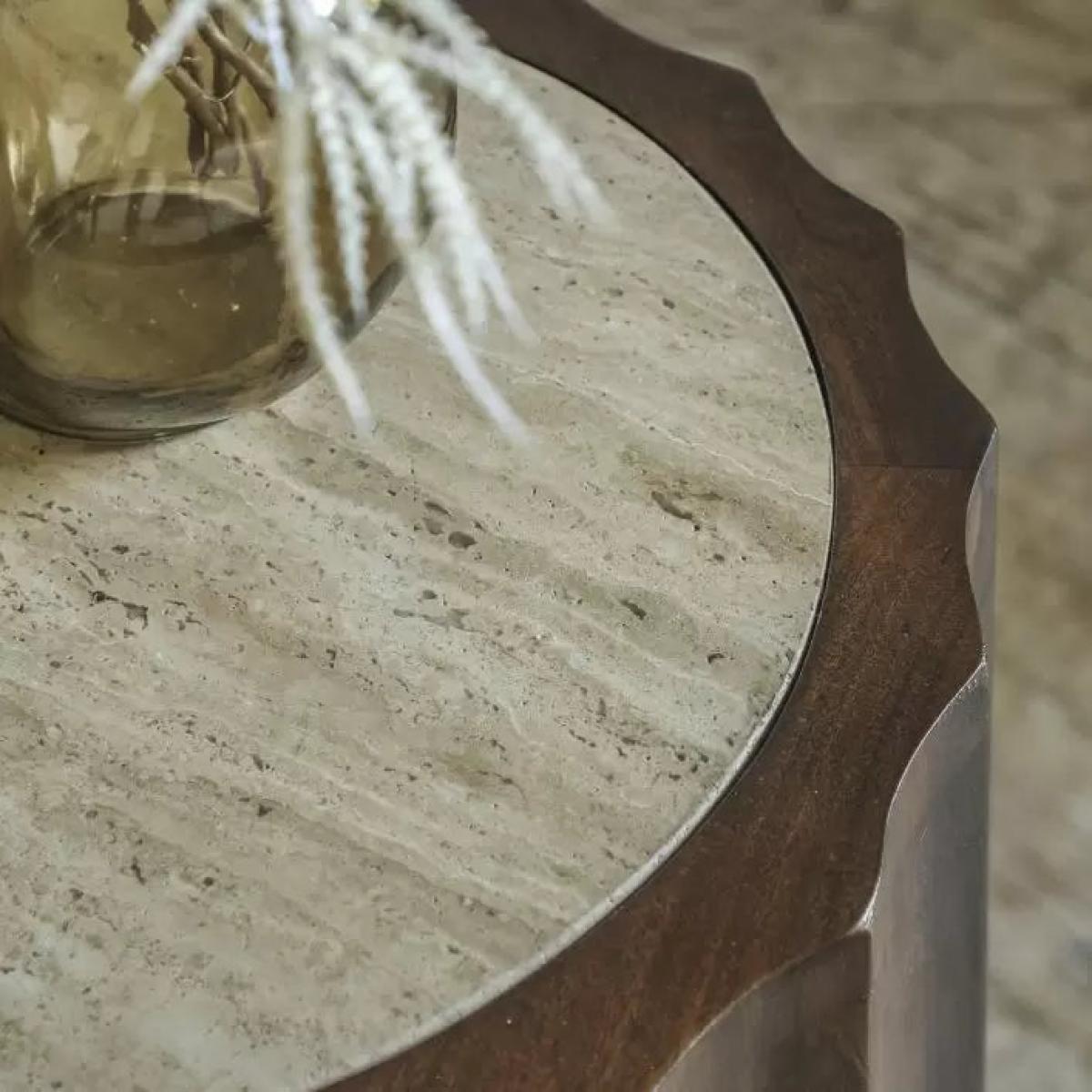 This stylish unusual side table features a round drum base crafted from mango wood with beautifully scalloped edges paired with a travertine stone inset top. A matching coffee table is also available.