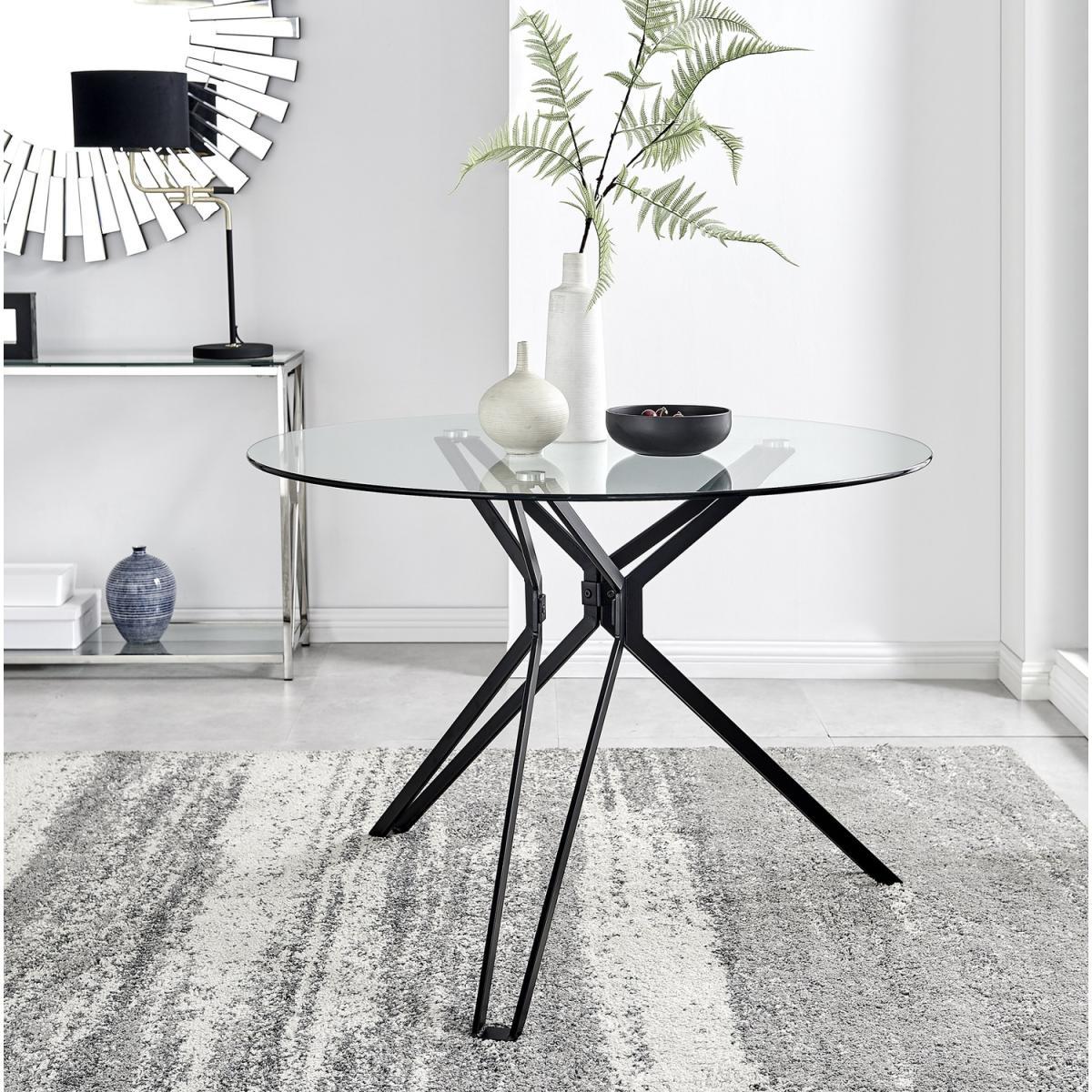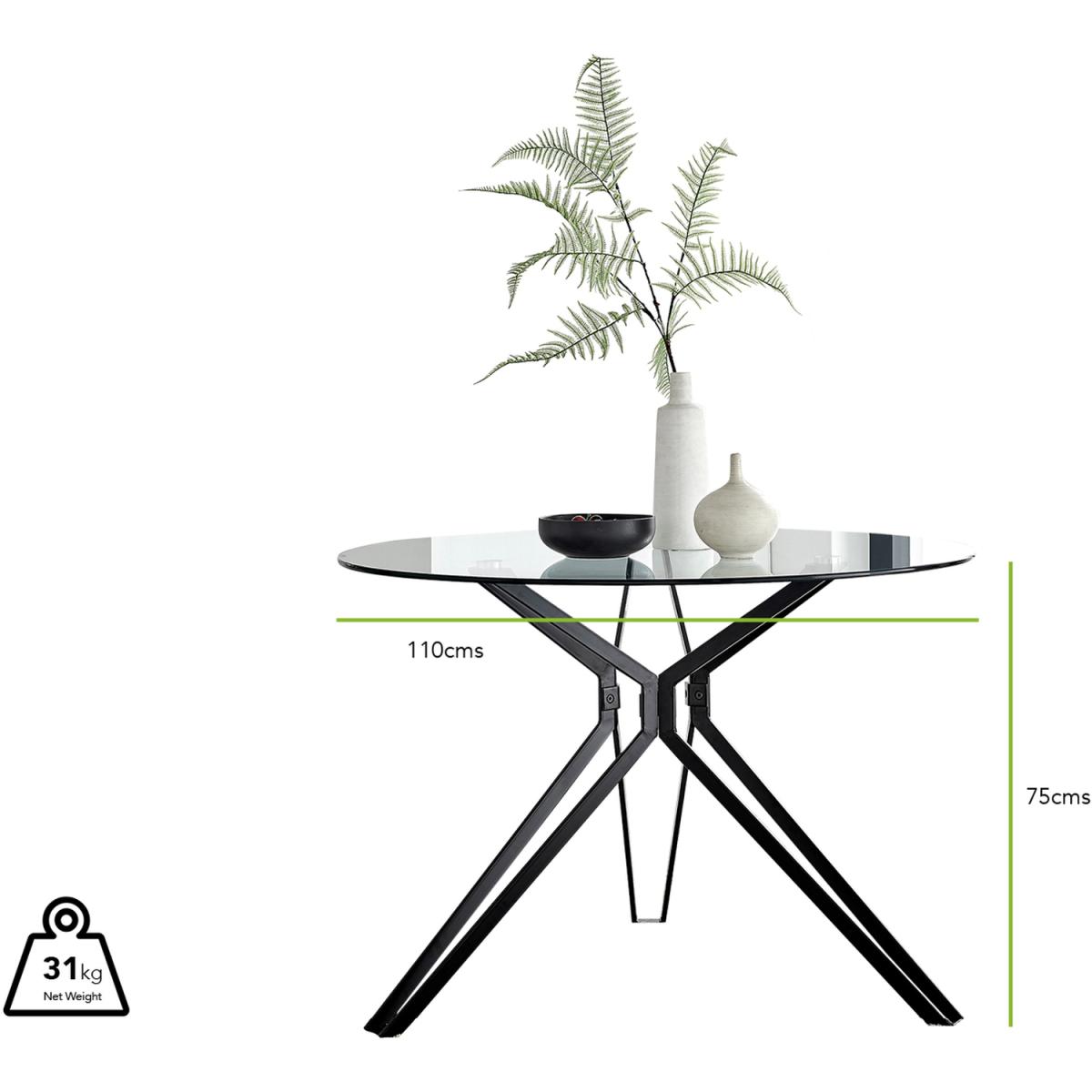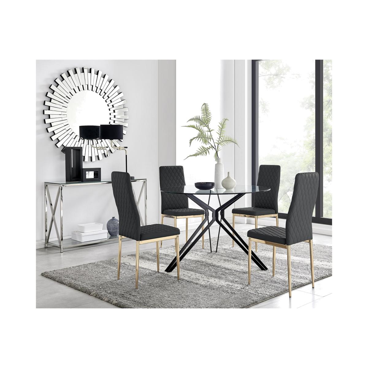The contemporary, clean lines of the Cascina round table make it hard to resist for those looking for elegance and functionality in their dining room. The exquisite matt-black angled hairpin legs perfectly support the 110cms diameter clear glass top, the textures complimenting the striking design. With ample space for up to 4 guests, this table is perfect for the modern home. Paired alongside our beautiful faux leather diamond quilted Milan dining chairs for a sophisticated contemporary look. The Milan chairs are made from high quality faux leather with trendy gold effect legs and are ergonomically designed for maximum comfort and back support. Made for regular use, the protective plastic feet will protect your floor from any damage. Available in elephant grey, cappuccino grey, white, black or mustard to add your own personality and complete this gorgeous dining set.