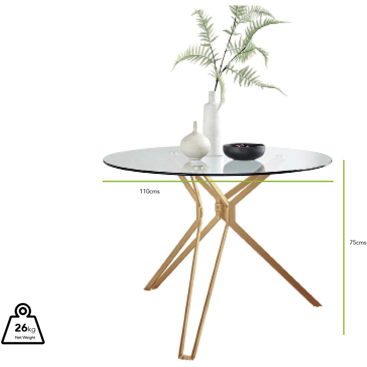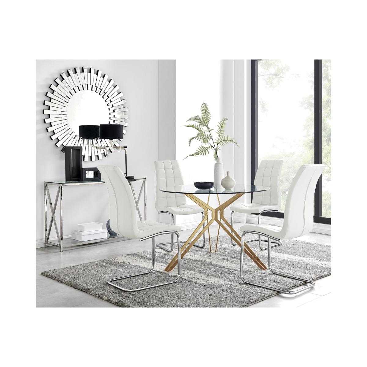 The contemporary, clean lines of the Cascina Gold round table make it hard to resist for those looking for elegance and functionality in their dining room. The exquisite gold angled hairpin legs perfectly support the 110cms diameter clear glass top, the textures complimenting the striking design. With ample space for up to 4 guests, this table is perfect for the modern home. Finished with our stylish cantilever Murano dining chairs, this set offers maximum comfort and elegance that will never go out of fashion! The Murano chairs feature an eye-catching hatched deep foam single piece seat pad and lumbar supporting back rest, making it a delight to sit on. With the chrome finish cantilevered base, the Murano is a perfect match to complete this dining set.