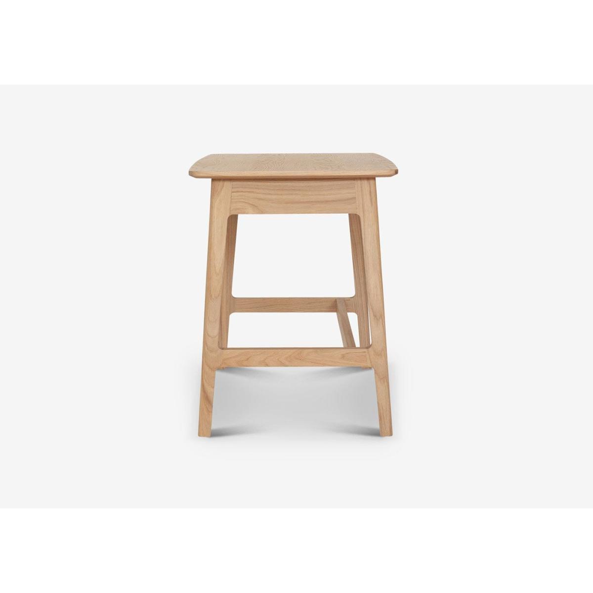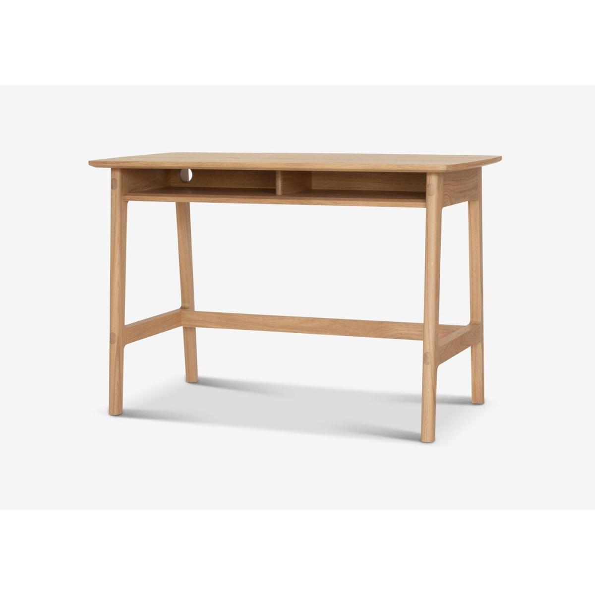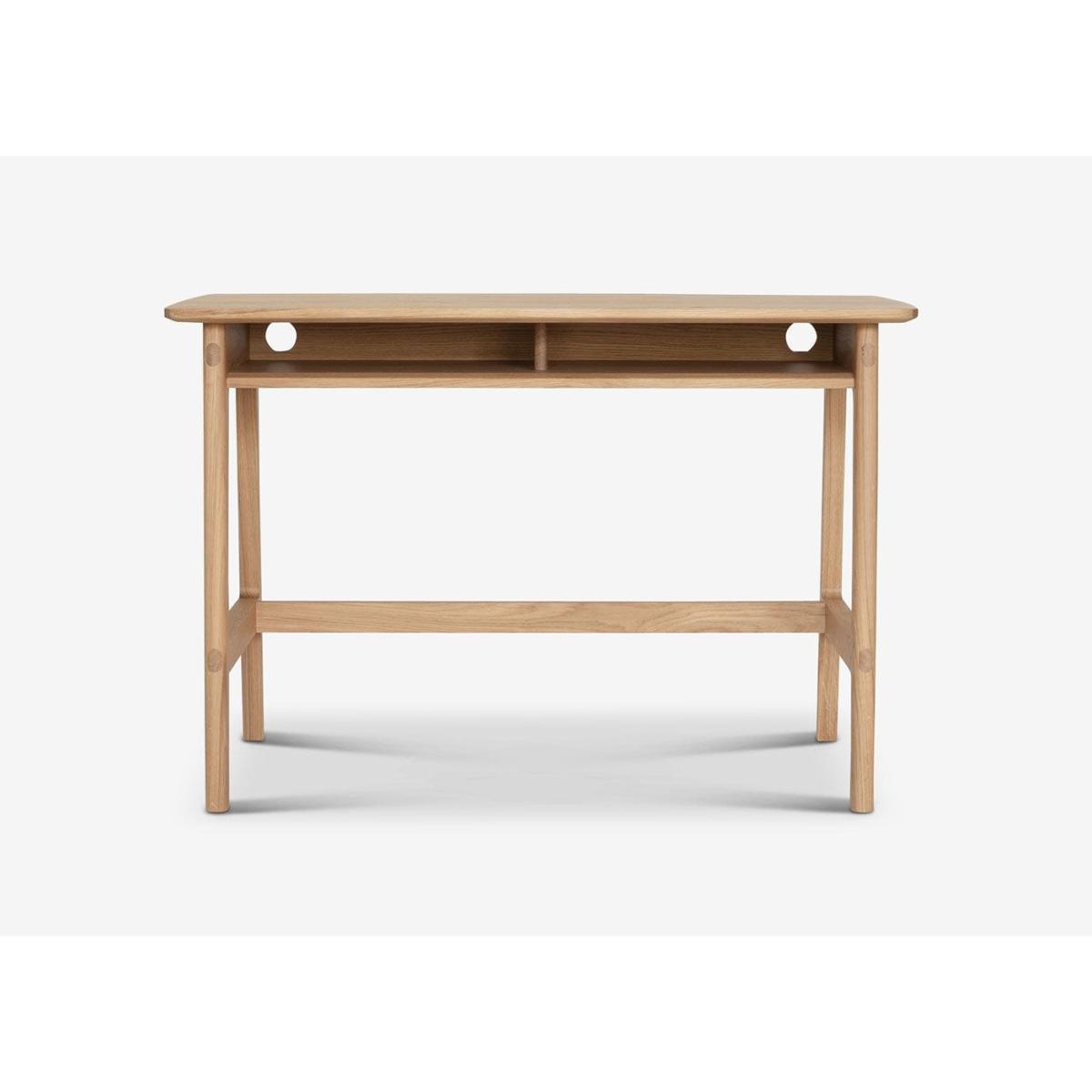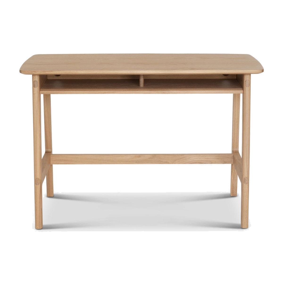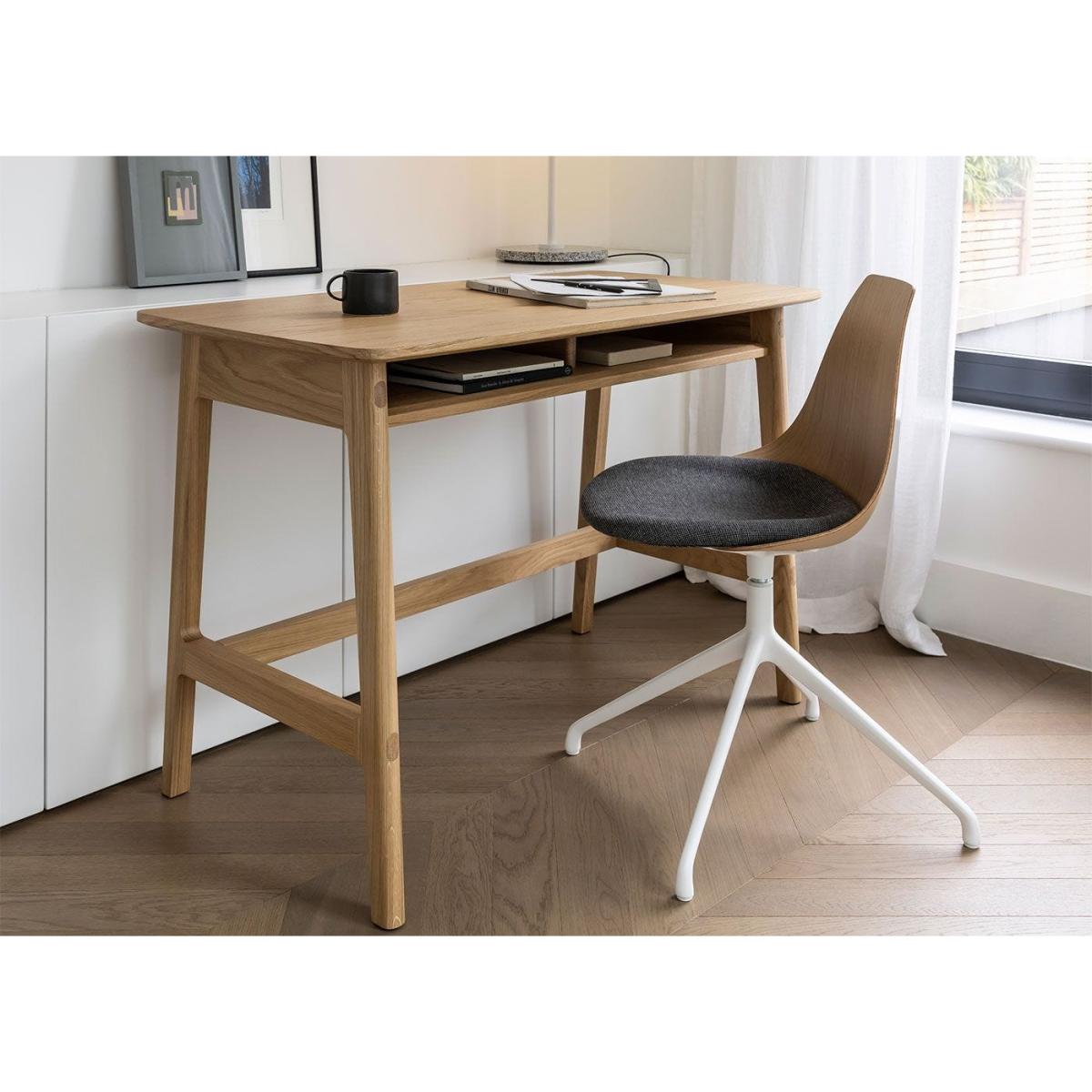 I’m a big fan of the Dulwich desk’s pared-back silhouette and warm oak finish - it slots straight into Scandi, modern farmhouse or pared-back contemporary schemes and won’t overwhelm a small study or hallway. The subtle under-top shelf is perfect for keeping notebooks or tech out of sight but close at hand. For a clean, functional set-up, keep the desktop clear except for a slim desk lamp and a low-profile pot for pens. Introduce texture with a woven tray or a stoneware mug, and hang a simple print just above to draw the eye upwards. A neutral-toned, upholstered task chair or a rattan seat will complement the oak, while a small potted plant adds a touch of liveliness without clutter.