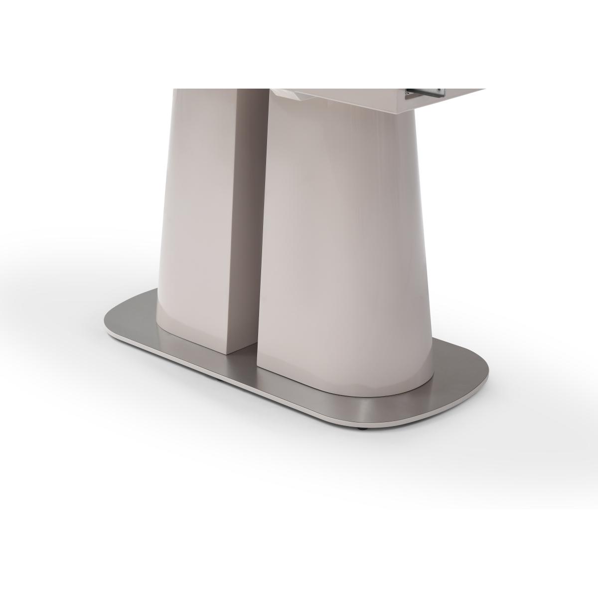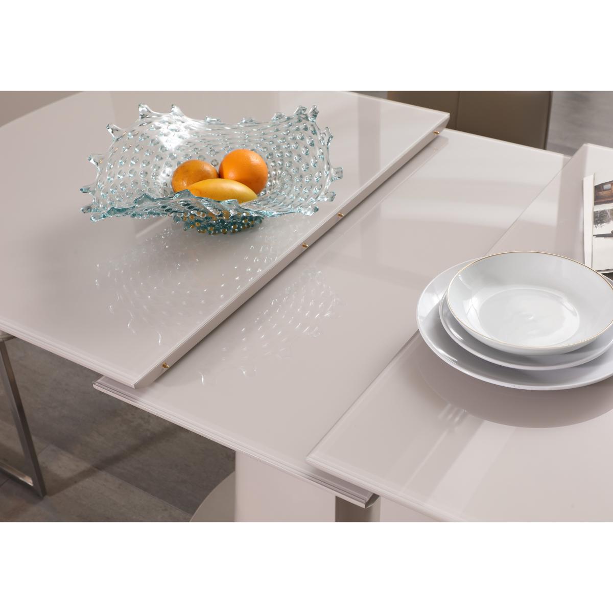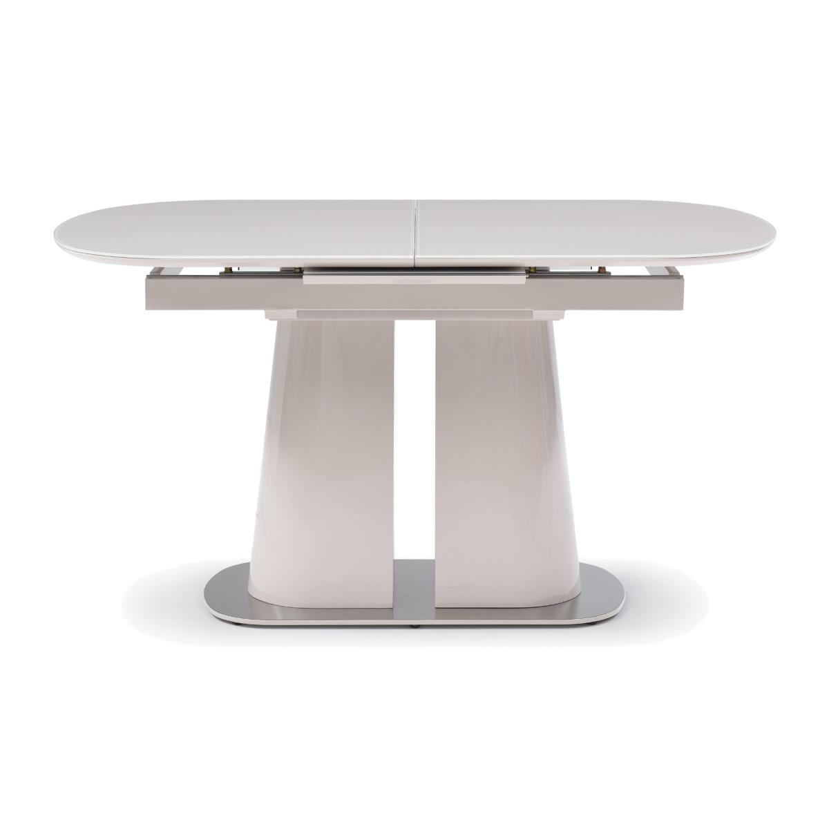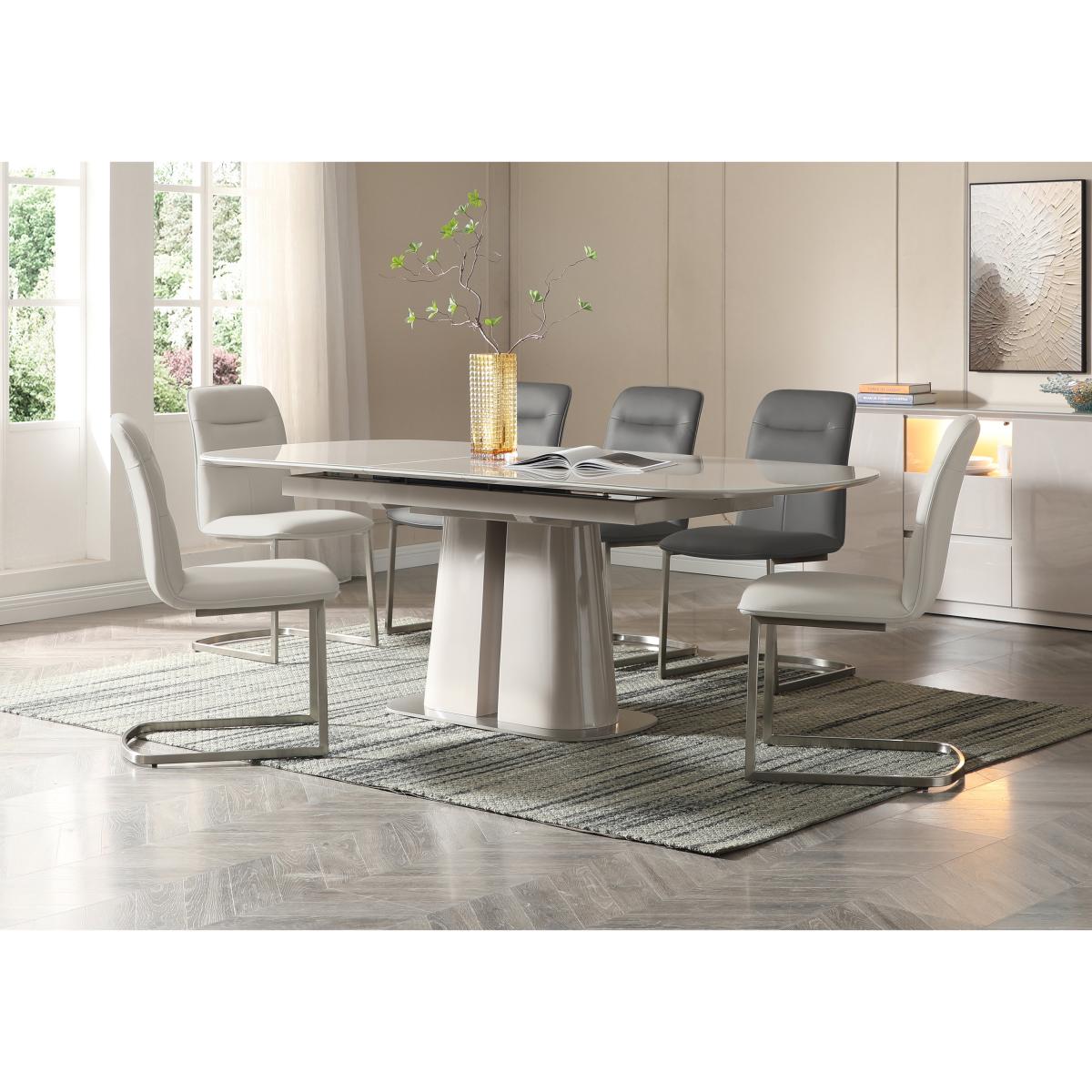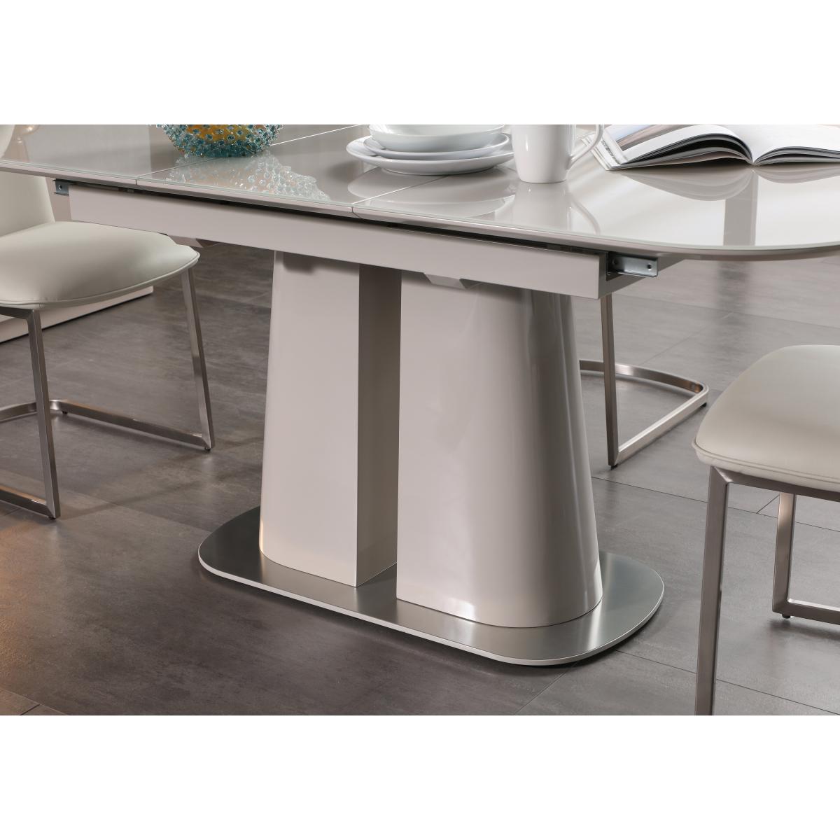 With its stunning high-gloss finish in cashmere-soft tones, our Cashmere range showcases a sophisticated modern design aesthetic that’s also very elegant. The range’s extending dining table and occasional tables are boat-shaped and have tempered glass tops, a combination that delivers beauty and durability in equal measure. The collection also includes dining chairs, dining sets and storage pieces that, with cantilever bases, pop-up extension mechanisms and built-in LED lighting respectively, offer the same impressive level of stylish functionality. The Cashmere range is only available at Furniture Village. Make a sophisticated statement with this extending dining table, a Furniture Village exclusive. The boat-shaped top has a tempered glass surface ensuring that its beauty is matched by its durability. Why you'll love it Sophisticated modern design with a flawless finish elevates any dining room. Boat-shaped dining table with a gorgeous, high-gloss cashmere-coloured surface. Tempered glass top ensures that it's practical and durable, too. Elegantly curved pedestal-style legs rest on a metal plinth. Super-smooth extension mechanism – simply pull on the table ends and an extra leaf pops up. In 2 sizes to seat up to 8 and 10 when extended. Exclusively available at Furniture Village. This pop-up extending dining table is part of our Cashmere range. What you need to know 140 cm dining table seats 6 closed and 8 when extended. 180 cm dining table seats 8 closed and 10 when extended. Tempered glass top. Stainless steel and metal base. Shop our Cashmere range for dining sets, dining chairs and more.