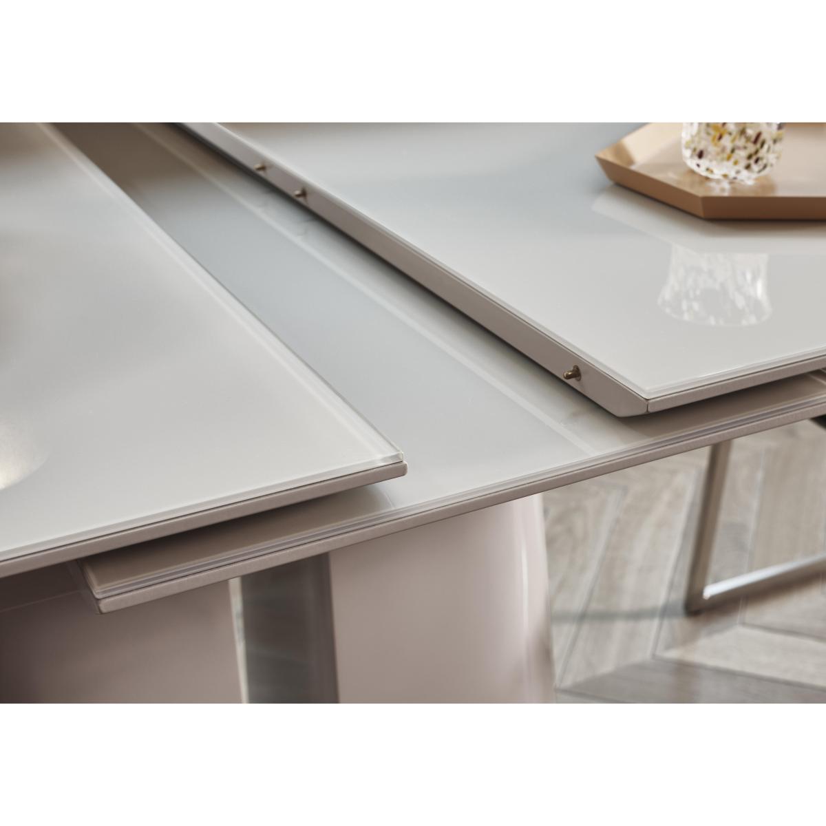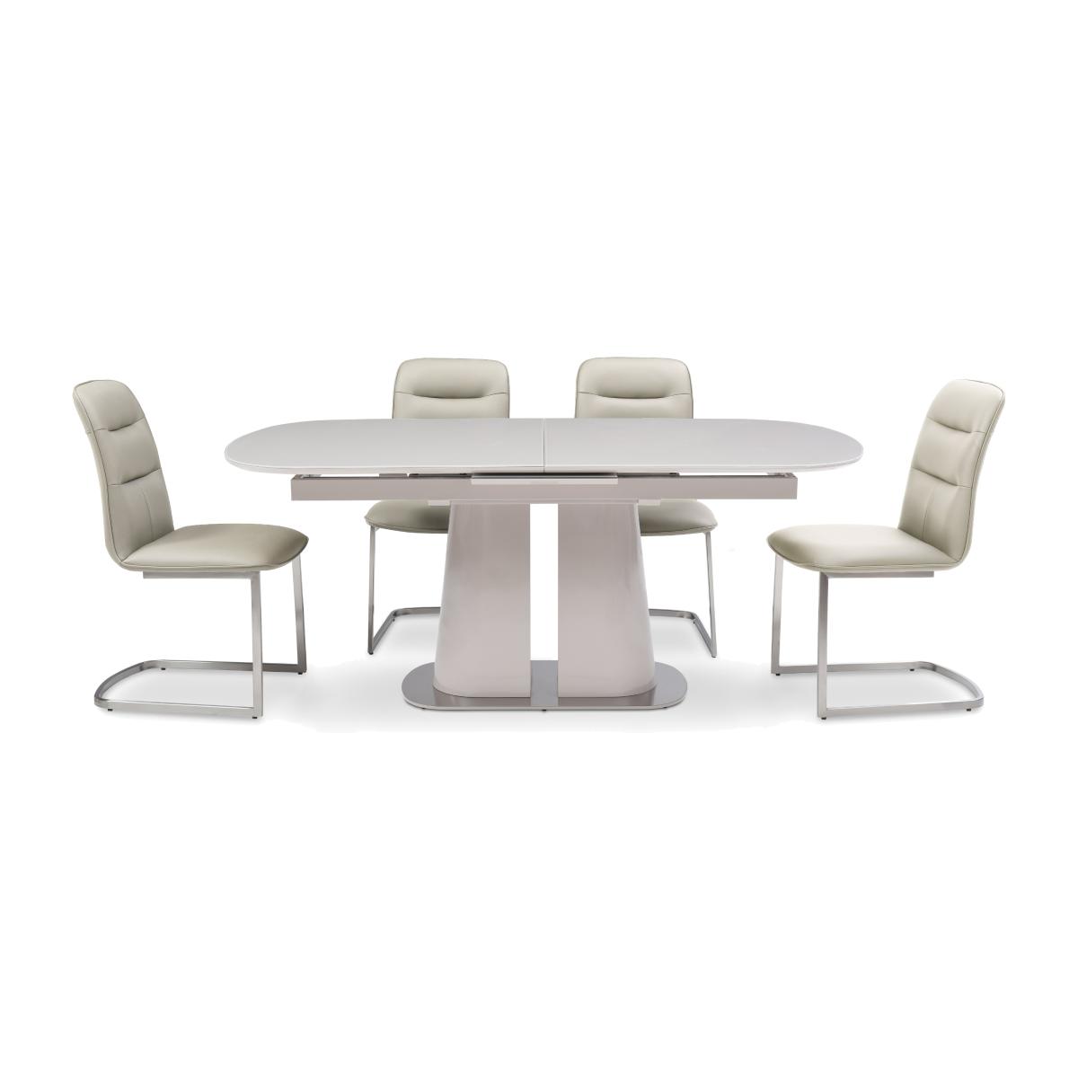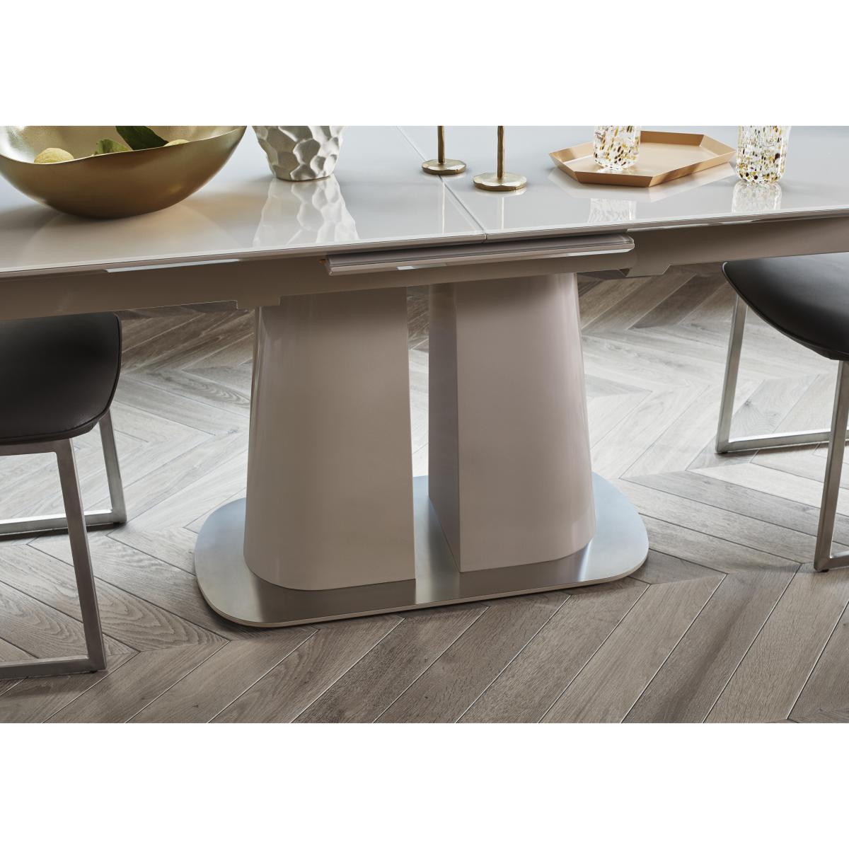 With its stunning high-gloss finish in cashmere-soft tones, our Cashmere range showcases a sophisticated modern design aesthetic that’s also very elegant. The range’s extending dining table and occasional tables are boat-shaped and have tempered glass tops, a combination that delivers beauty and durability in equal measure. The collection also includes dining chairs, dining sets and storage pieces that, with cantilever bases, pop-up extension mechanisms and built-in LED lighting respectively, offer the same impressive level of stylish functionality. The Cashmere range is only available at Furniture Village. Stunning and sophisticated, this dining set showcases an array of sleek finishes – from the high-gloss, tempered glass of the boat-shaped table to the metal frames of the cantilever chairs. Why you'll love it Sophisticated modern design with a flawless finish elevates any dining room. Boat-shaped dining table with a gorgeous, high-gloss cashmere-coloured surface. Tempered glass top ensures that it's practical and durable, too. Elegantly curved pedestal-style legs rest on a metal plinth. Super-smooth extension mechanism – simply pull on the table ends and an extra leaf pops up. In 2 sizes to seat up to 8 and 10 when extended. Dining set includes 4 dining chairs. Chairs have metal cantilever frames and very comfortable cushioning. Soft faux leather upholstery in a choice of colours. Exclusively available at Furniture Village. This pop-up extending dining set is part of our Cashmere range. What you need to know Dining chairs have stainless steel frames and foam cushioning. 140 cm dining table seats 6 closed and 8 when extended. 180 cm dining table seats 8 closed and 10 when extended. Tempered glass top. Stainless steel and metal base. Shop our Cashmere range for dining sets, dining chairs and more. Item code: CMRESET6TAUP-001