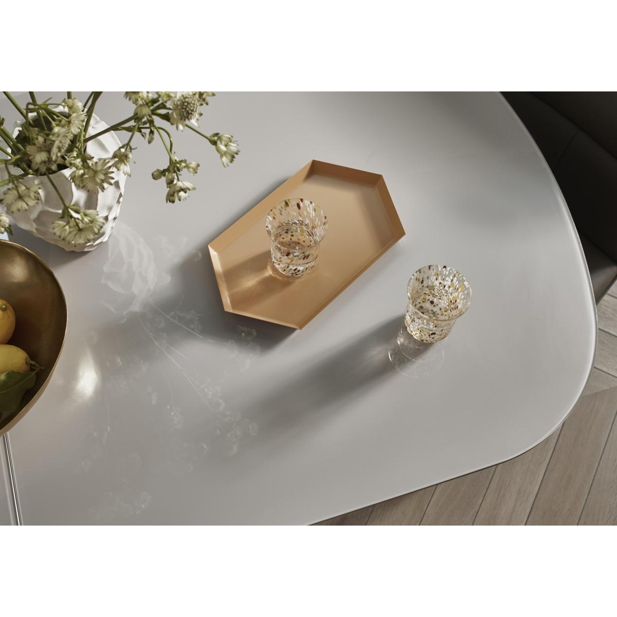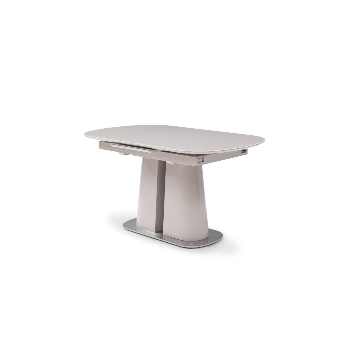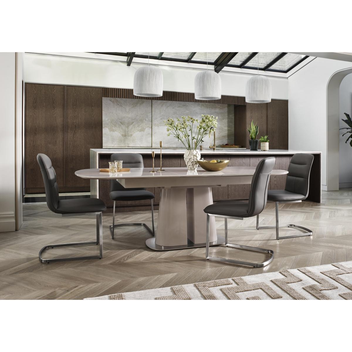 With its stunning high-gloss finish in cashmere-soft tones, our Cashmere range showcases a sophisticated modern design aesthetic that’s also very elegant. The range’s extending dining table and occasional tables are boat-shaped and have tempered glass tops, a combination that delivers beauty and durability in equal measure. The collection also includes dining chairs, dining sets and storage pieces that, with cantilever bases, pop-up extension mechanisms and built-in LED lighting respectively, offer the same impressive level of stylish functionality. The Cashmere range is only available at Furniture Village. Stunning and sophisticated, this dining set showcases an array of sleek finishes – from the high-gloss, tempered glass of the boat-shaped table to the metal frames of the cantilever chairs. Why you'll love it Sophisticated modern design with a flawless finish elevates any dining room. Boat-shaped dining table with a gorgeous, high-gloss cashmere-coloured surface. Tempered glass top ensures that it's practical and durable, too. Elegantly curved pedestal-style legs rest on a metal plinth. Super-smooth extension mechanism – simply pull on the table ends and an extra leaf pops up. In 2 sizes to seat up to 8 and 10 when extended. Dining set includes 4 dining chairs. Chairs have metal cantilever frames and very comfortable cushioning. Soft faux leather upholstery in a choice of colours. Exclusively available at Furniture Village. This pop-up extending dining set is part of our Cashmere range. What you need to know Dining chairs have stainless steel frames and foam cushioning. 140 cm dining table seats 6 closed and 8 when extended. 180 cm dining table seats 8 closed and 10 when extended. Tempered glass top. Stainless steel and metal base. Shop our Cashmere range for dining sets, dining chairs and more. Item code: CMRESET6TAUP-001