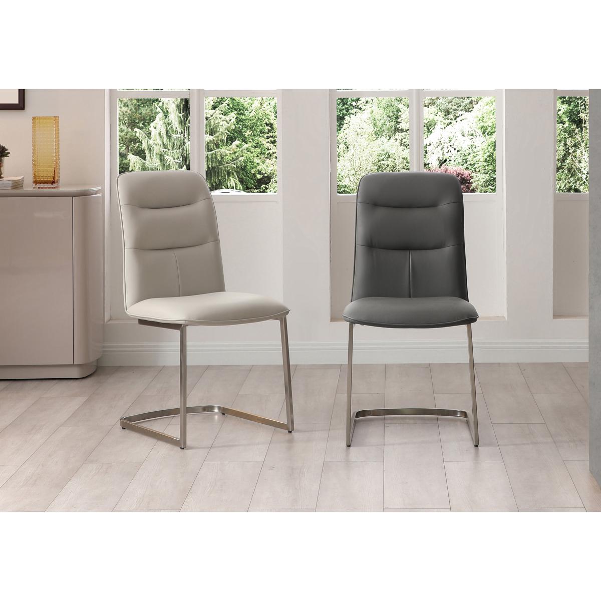 With its stunning high-gloss finish in cashmere-soft tones, our Cashmere range showcases a sophisticated modern design aesthetic that’s also very elegant. The range’s extending dining table and occasional tables are boat-shaped and have tempered glass tops, a combination that delivers beauty and durability in equal measure. The collection also includes dining chairs, dining sets and storage pieces that, with cantilever bases, pop-up extension mechanisms and built-in LED lighting respectively, offer the same impressive level of stylish functionality. The Cashmere range is only available at Furniture Village. Treat your dinner guests to sleek style and incredible comfort in the form of this set of six sophisticated dining chairs with cantilever frames. Why you'll love it Sophisticated modern design with a flawless finish elevates any dining room. Dining chairs have metal cantilever frames. Comfortably cushioned and upholstered in soft faux leather. Choice of upholstery colours. Also offered in sets of 2 and 4 dining chairs. Exclusively available at Furniture Village. This set of 6 dining chairs is part of our Cashmere range. What you need to know Chairs have stainless steel frames. Foam cushioning. Shop our Cashmere range for dining sets, dining chairs and more.