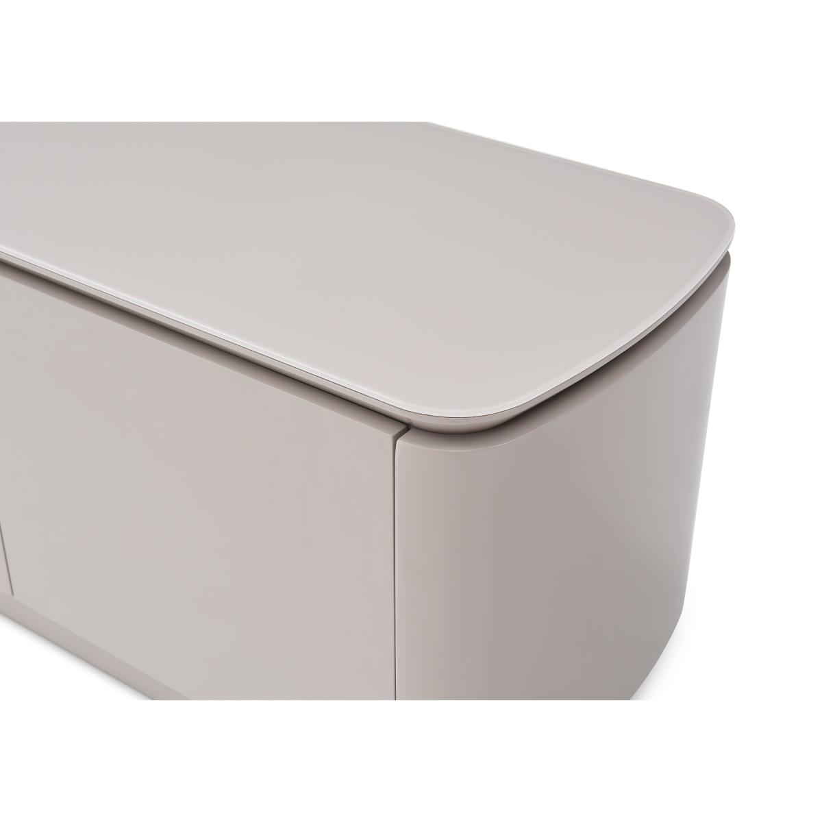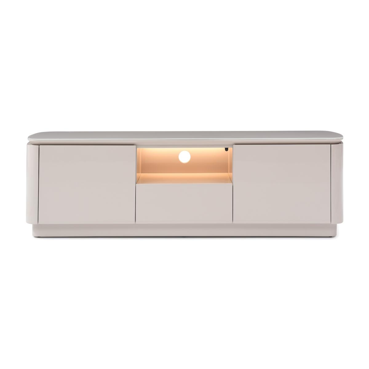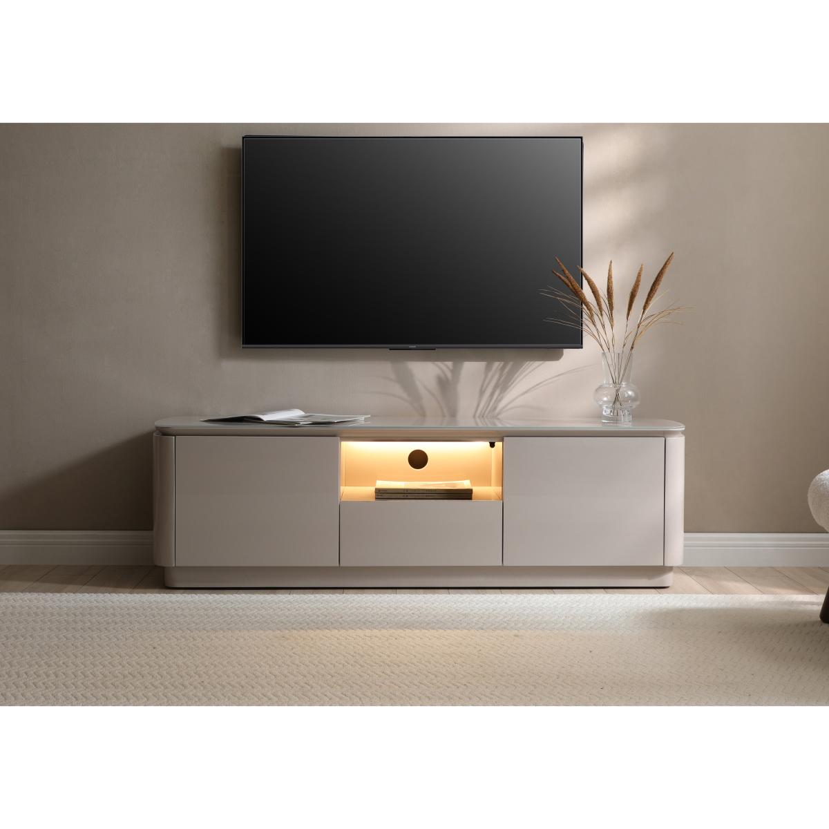With its stunning high-gloss finish in cashmere-soft tones, our Cashmere range showcases a sophisticated modern design aesthetic that’s also very elegant. The range’s extending dining table and occasional tables are boat-shaped and have tempered glass tops, a combination that delivers beauty and durability in equal measure. The collection also includes dining chairs, dining sets and storage pieces that, with cantilever bases, pop-up extension mechanisms and built-in LED lighting respectively, offer the same impressive level of stylish functionality. The Cashmere range is only available at Furniture Village. Make TV watching and media storage more stylish with this beautiful TV unit complete with alcove LED lighting. It’s part of our exclusive Cashmere range. Why you'll love it Sophisticated modern design with a flawless finish elevates any dining room. Elegantly curved TV unit with a gorgeous, high-gloss cashmere-coloured surface. Tempered glass top ensures that it's practical and durable, too. Built-in LED lighting. Soft-closing cupboard doors and drawers. Exclusively available at Furniture Village. This TV unit is part of our Cashmere range. What you need to know 2 cupboards each have an adjustable shelf. 1 drawer. Tempered glass top. Shop our Cashmere range for dining sets, dining chairs and more.