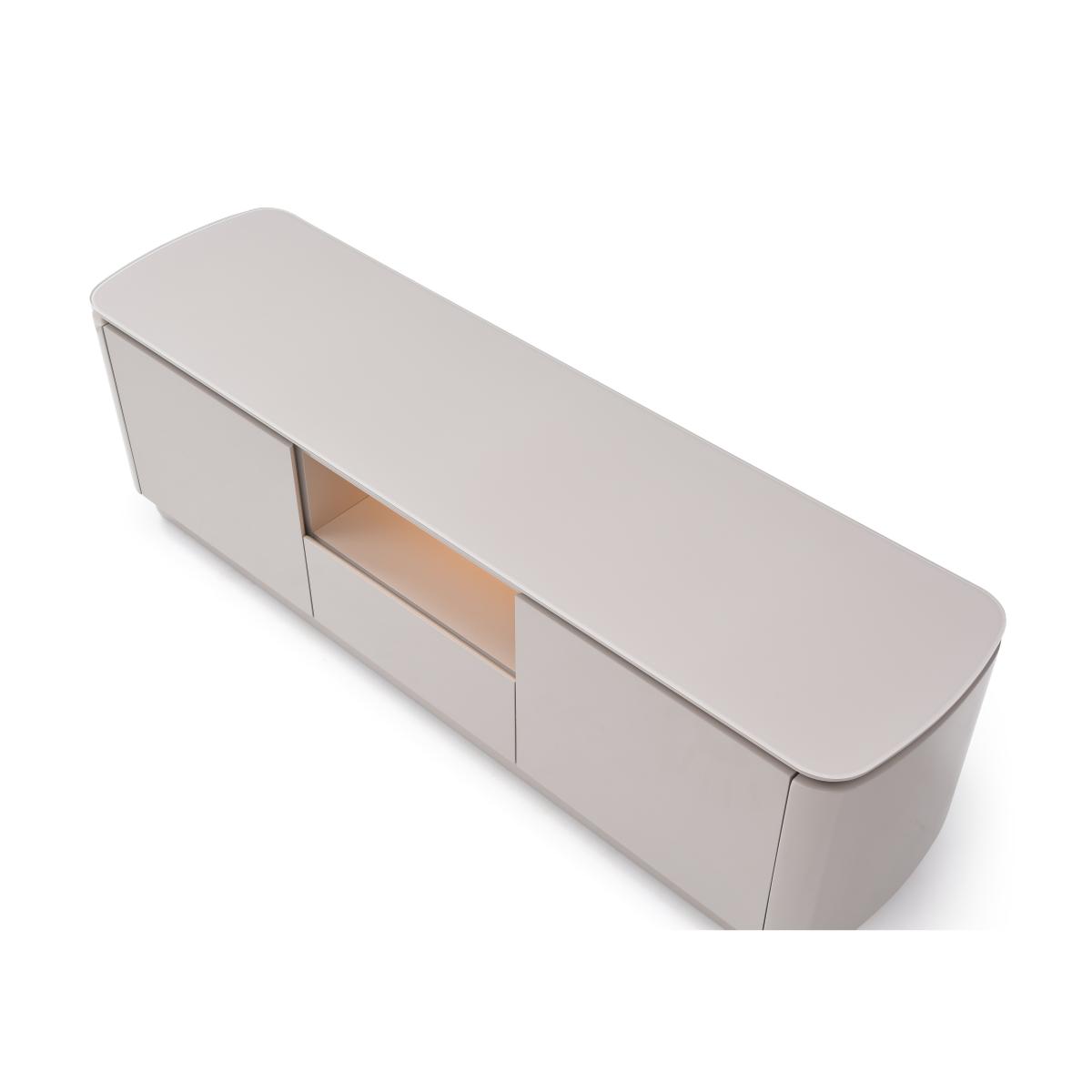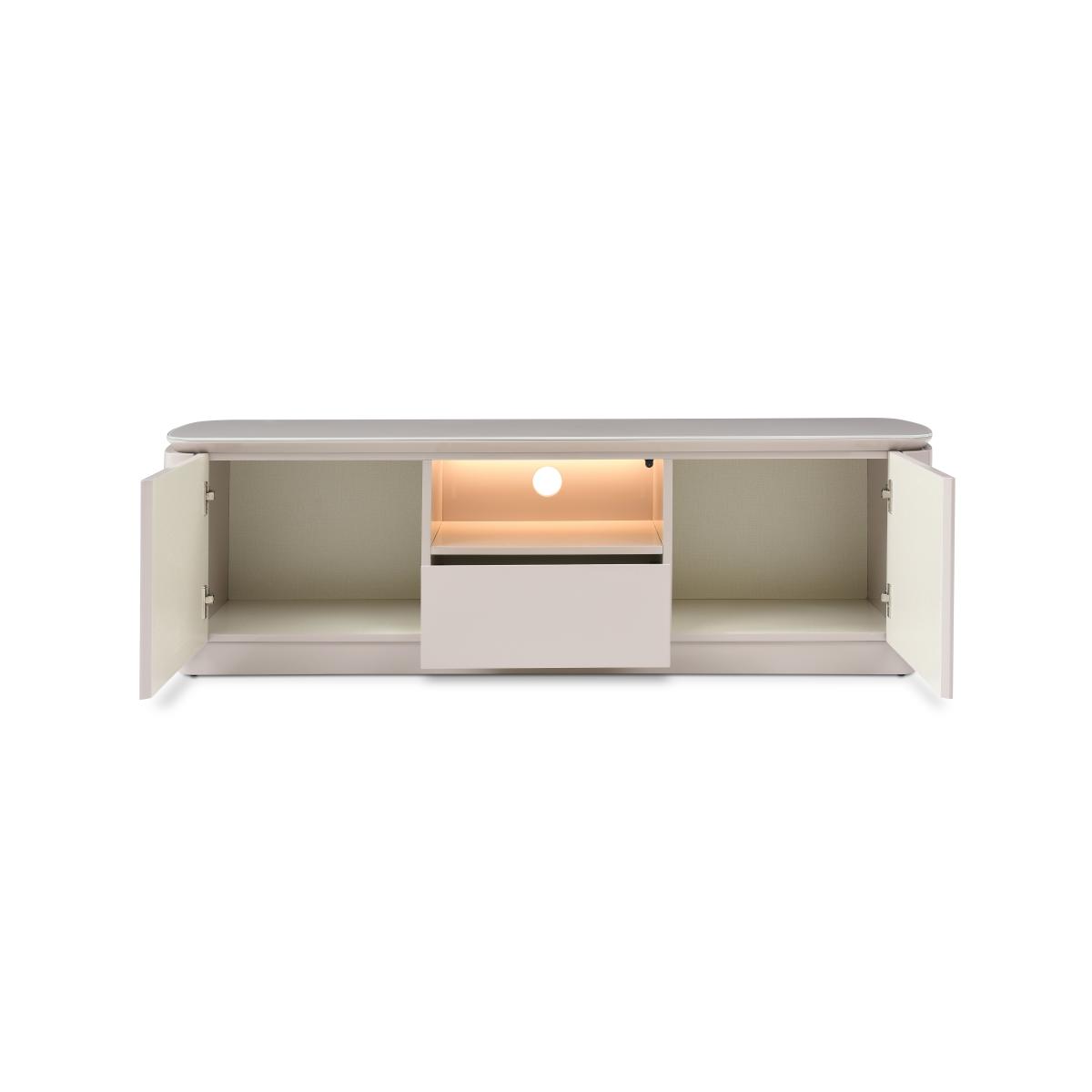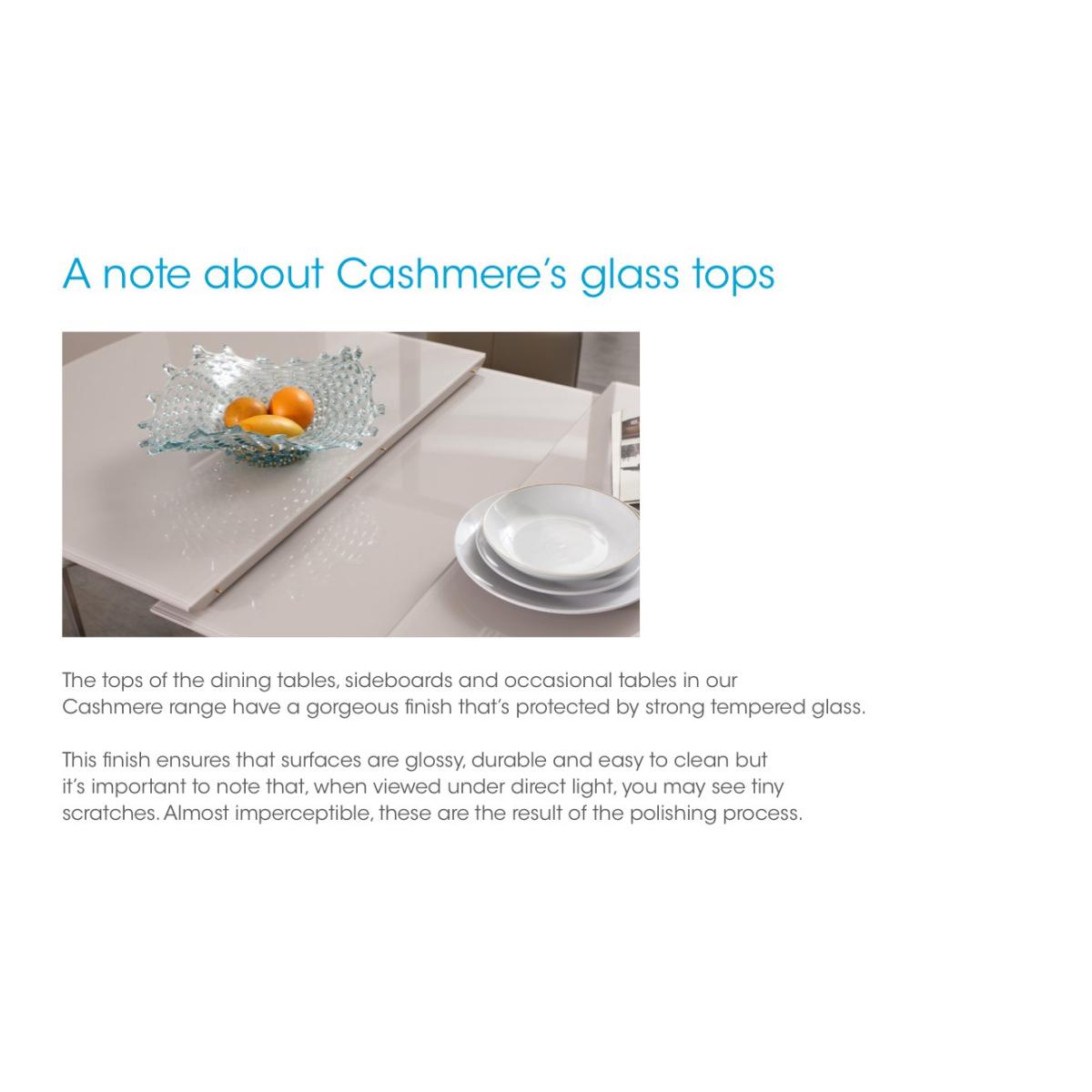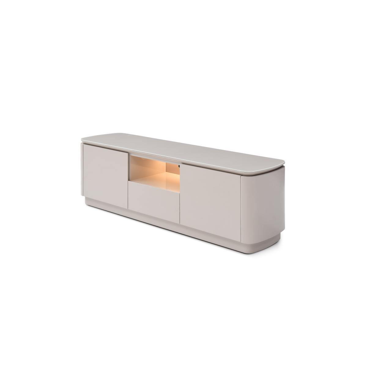 With its stunning high-gloss finish in cashmere-soft tones, our Cashmere range showcases a sophisticated modern design aesthetic that’s also very elegant. The range’s extending dining table and occasional tables are boat-shaped and have tempered glass tops, a combination that delivers beauty and durability in equal measure. The collection also includes dining chairs, dining sets and storage pieces that, with cantilever bases, pop-up extension mechanisms and built-in LED lighting respectively, offer the same impressive level of stylish functionality. The Cashmere range is only available at Furniture Village. Make TV watching and media storage more stylish with this beautiful TV unit complete with alcove LED lighting. It’s part of our exclusive Cashmere range. Why you'll love it Sophisticated modern design with a flawless finish elevates any dining room. Elegantly curved TV unit with a gorgeous, high-gloss cashmere-coloured surface. Tempered glass top ensures that it's practical and durable, too. Built-in LED lighting. Soft-closing cupboard doors and drawers. Exclusively available at Furniture Village. This TV unit is part of our Cashmere range. What you need to know 2 cupboards each have an adjustable shelf. 1 drawer. Tempered glass top. Shop our Cashmere range for dining sets, dining chairs and more.