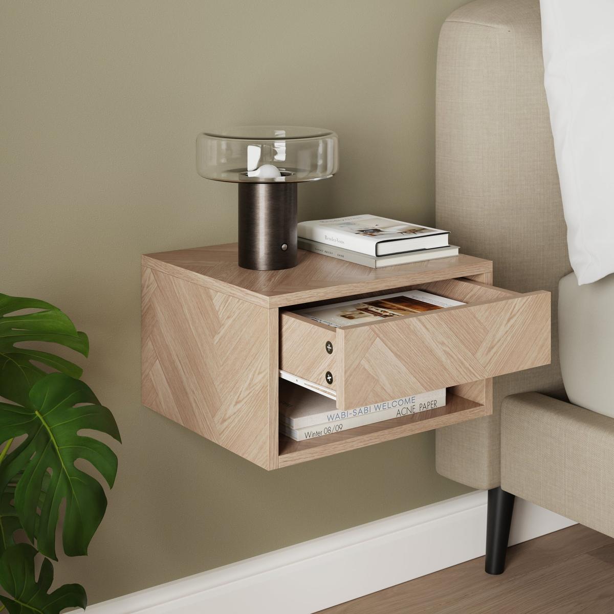 * Floating bedside table * Invisible fixings * 1 drawer plus open shelf * Mid-oak effect Looking for a clean, modern look in your bedroom? Search no more - the Casper Floating Bedside Table has you covered. The floating design means there are no visible fixings, and the sleek, simple design is great for modern interiors. The mid-oak effect features diagonal patterns for subtle interest. There's one drawer for storage, plus an open shelf - perfect for your evening reads.