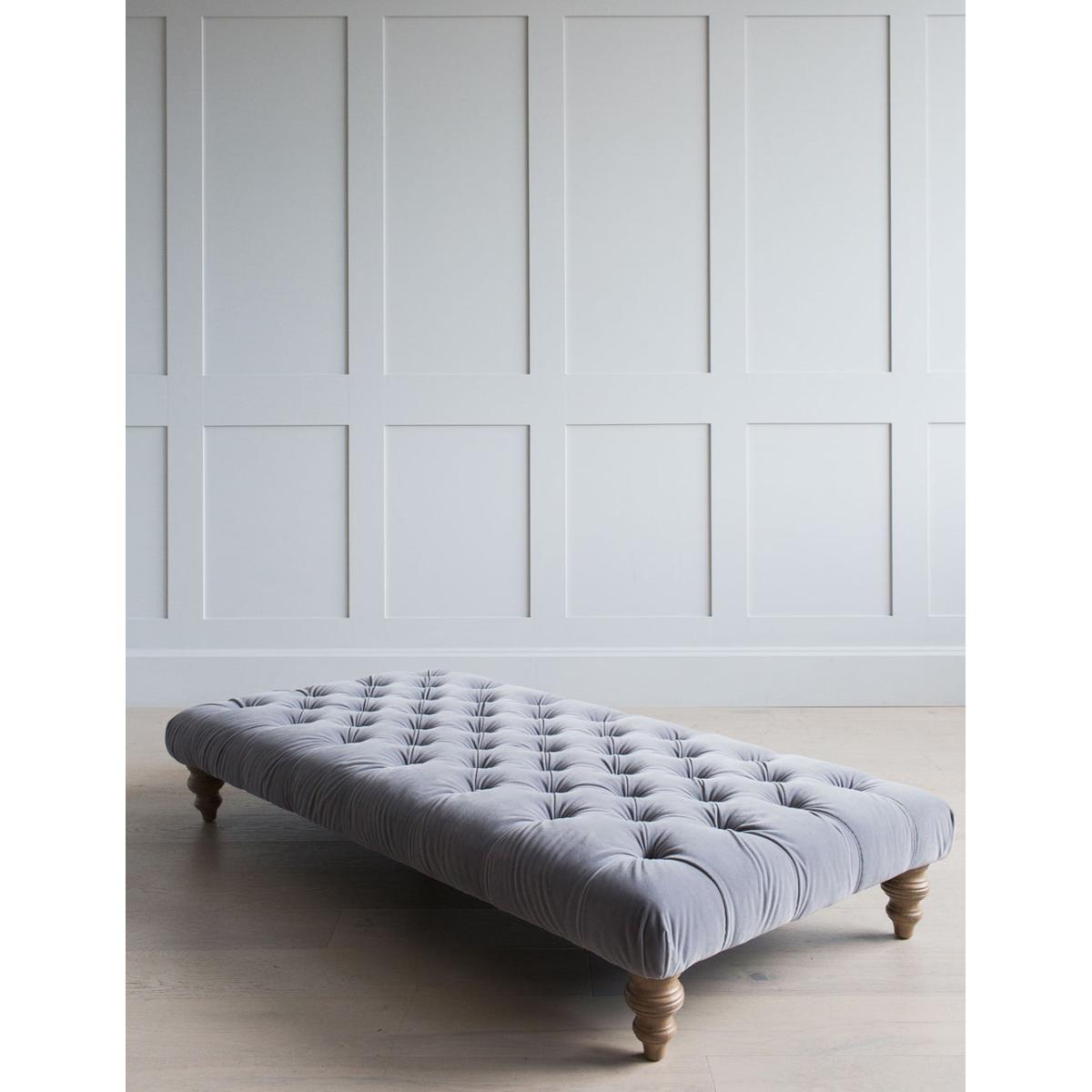 The perfect piece of multi-functional furniture, our Casper ottoman is one of those items that you’ll wonder how you lived without. This is a large piece of furniture that works best in big reception rooms, but it earns its keep with its many uses. Use it as a place to rest your weary feet at the end of a long day, as an alternative to a coffee table or as extra seating when you have guests. The deep buttoned style make it the perfect companion to our Hugo and Albert sofas, but the ottoman will work with any of the styles in our Snuggle collection. Photographed here in Grey Velvet. The leg colour in the photograph is Driftwood. All other images are computer generated as a colour reference with a Driftwood leg. We recommend you order a free fabric swatch to see your chosen material up close before ordering your sofa, armchair or footstool!