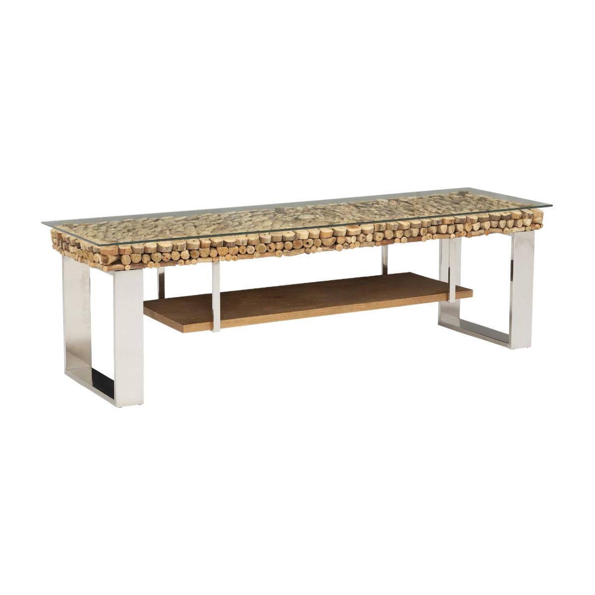 This Caspian buffet TV unit is sure to captivate your living space with its beautiful natural driftwood top and contrasting stainless steel legs. Its handy fixed pinewood shelf features stunning natural wooden characteristics; providing a rustic modern feel, sitting low to the floor it is perfect for all of your entertainment devices while its thoughtful design is sure to keep all wires predominantly out of view. Generously sized, you can also accessorise with not just your television but a coup