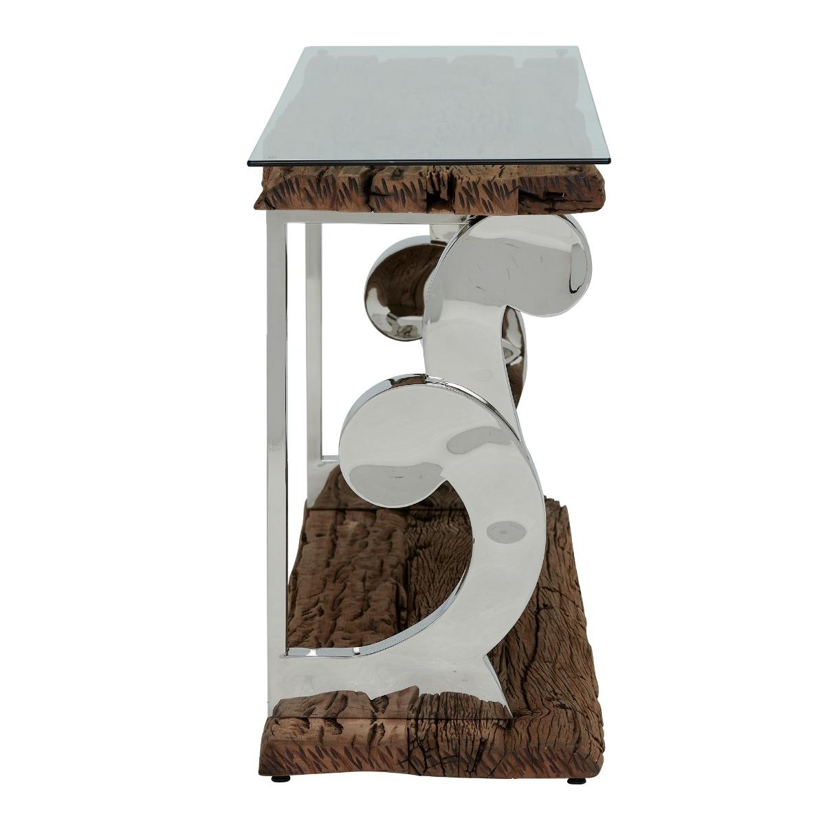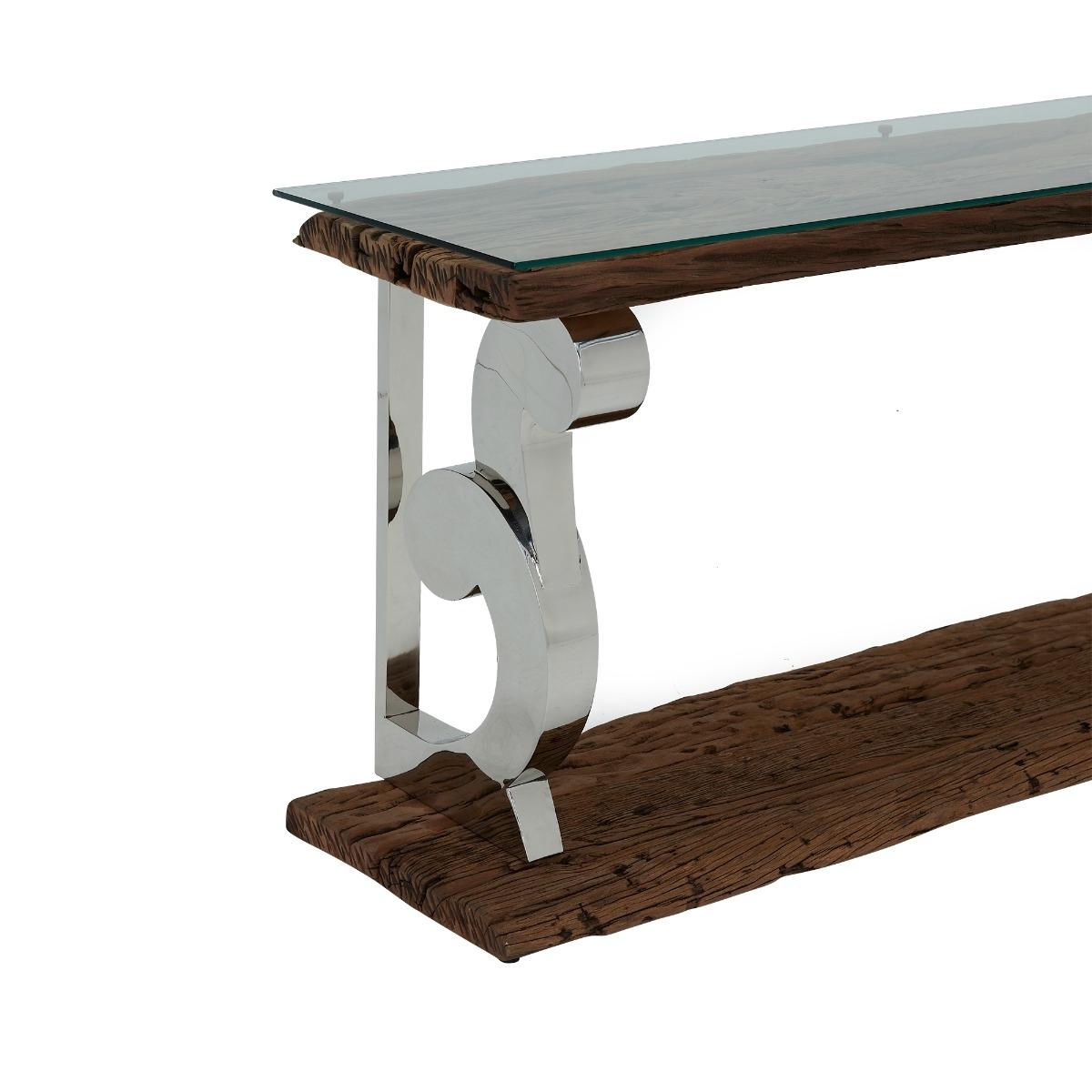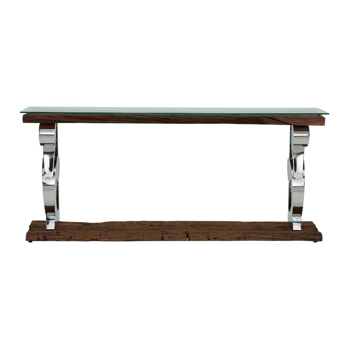 Design. Bursting with unique character, the Caspian Delices Console Table with Glass Top is the perfect addition to any space. It's rustic yet chic and super modern style, suits a wide range of interiors from town and country to sleek contemporary, and will be much adored for generations. With a warming naturalistic railway wood frame that’s complete with distinctively shaped stainless-steel sides and a glass top, the different materials contrast beautifully together, creating a quirky, luxurious piece that’s simply impossible to ignore.