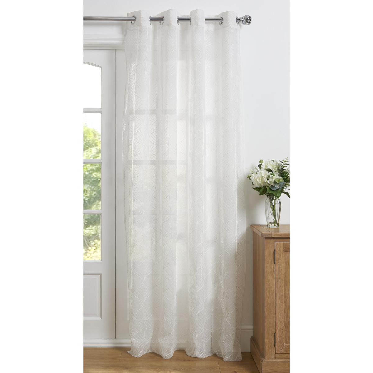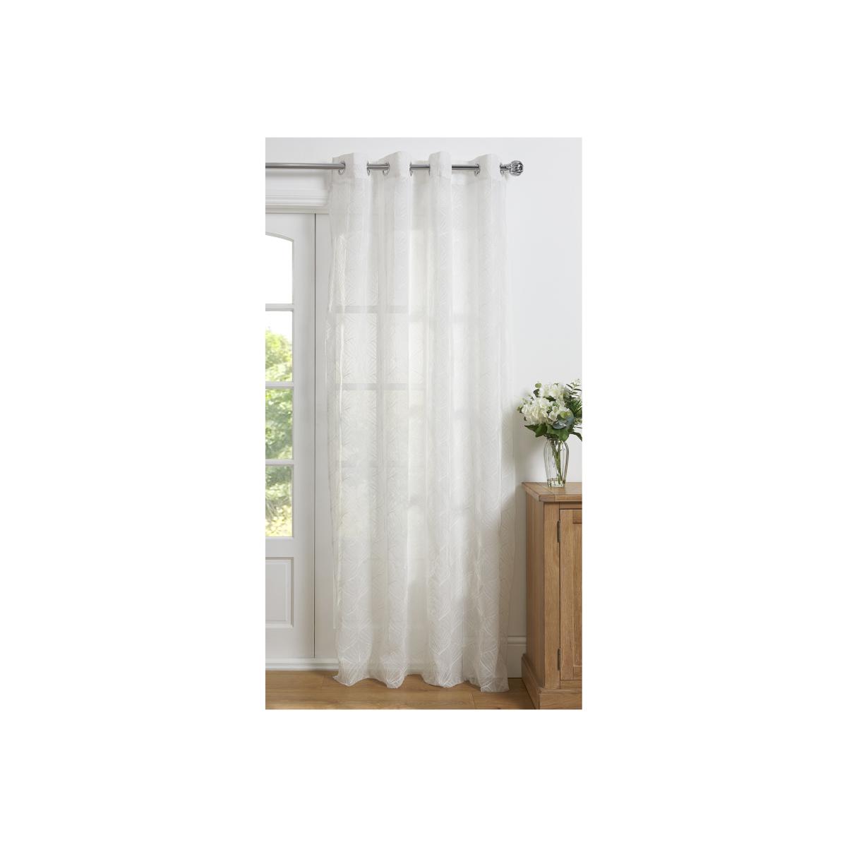 The sheer fabric of this lightweight Cassia Deco Embroidered White Voile flows down in an elegant form, allowing light to pass through while adding desirable privacy to your home. Perfect for hanging in front of glass doors from its silver eyelet headers, its glamorous Art Deco-inspired pattern in pure white will tasteful class to any modern or traditional style.
