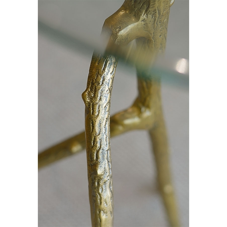 Contemporary sculptural design. Organic form derived from the forms of Cassia branches. Toughened glass top. Characterful carved base. Cast aluminium with brass effect finish.