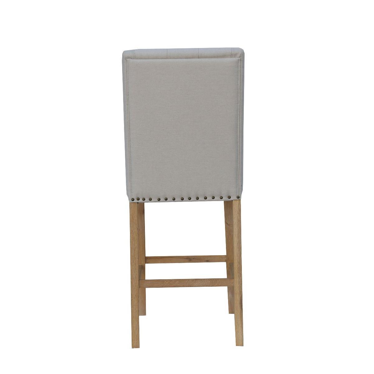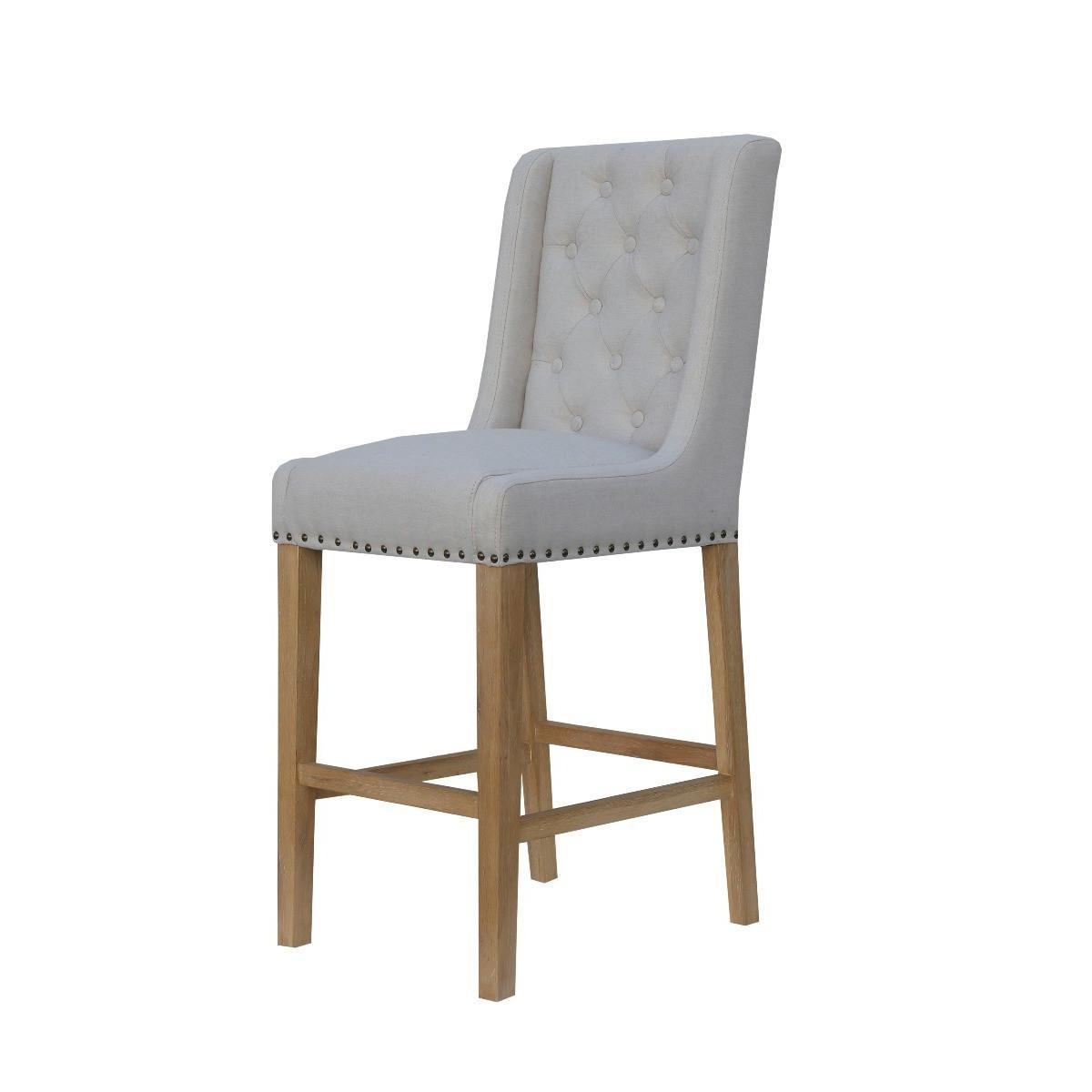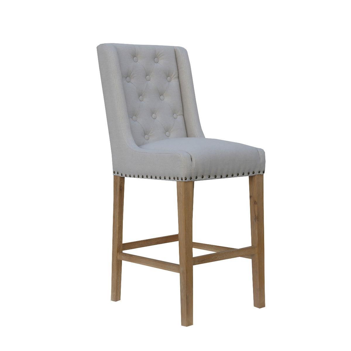 This is a tastefully designed stool that features smooth natural upholstery and long solid legs. With a durable solid wood frame and button detailing, the stools are complete with a brass stud trim. Smooth fabric stool with elegant buttoning. Seat height of 70 cm. Robust and solid oak legs that provide stability and support. Side supports that give the stool extra support. High backrest provides support and comfort. Also comes in models with light grey and dark grey upholstery. Comes ready assembled.