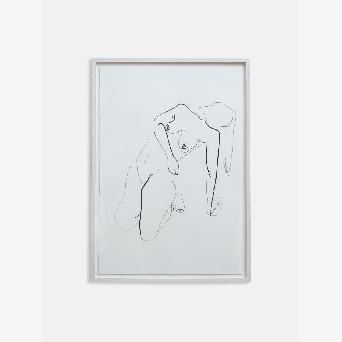 Specialising in simplified figure drawing, Alexandria Coe plays with the idea of womanhood and the stereotypes associated with it to ignite conversation with her work. Rather than create loud, aggressive shapes, she focuses on the vulnerable, the quiet and the strong. To Coe 'an unclothed body is a body without social norms and boundaries'. 'Cassie In The Studio 1' by Alexandria Coe Charcoal on cartridge paper White timber frame and glass Exclusive piece From the M.A.H Gallery collection Includes M.A.H branded certificate of authenticity