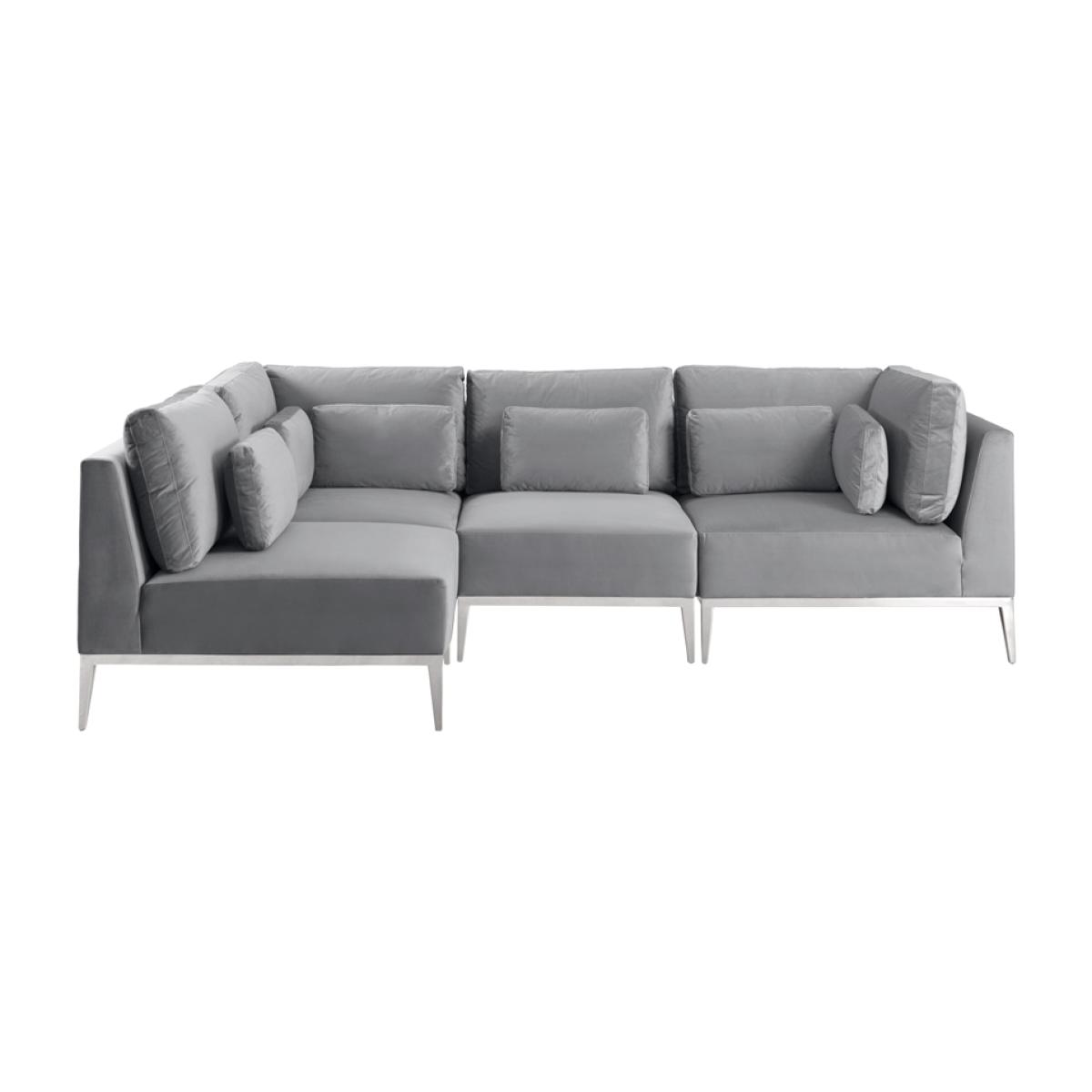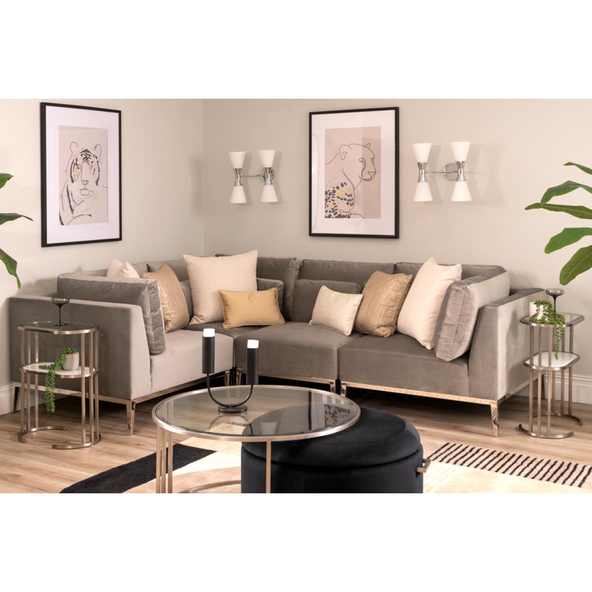 Contemporary design inspired by luxurious Italian interiors. Sprung seat and backrest with deep foam and fibre topping. Cushions filled with a mixture of foam, fibre and feathers. Velvet upholstery fabric. Polished stainless steel frame. Constructed from modular components that simply and securely connect together, allowing for ease of installation and multiple configurations. Free returns on sofas if you change your mind within 7 days. Simply notify us, put the sofa back in the box, and we will collect and send you a full refund. (This offer excludes Scottish highlands and islands & any Ireland addresses).